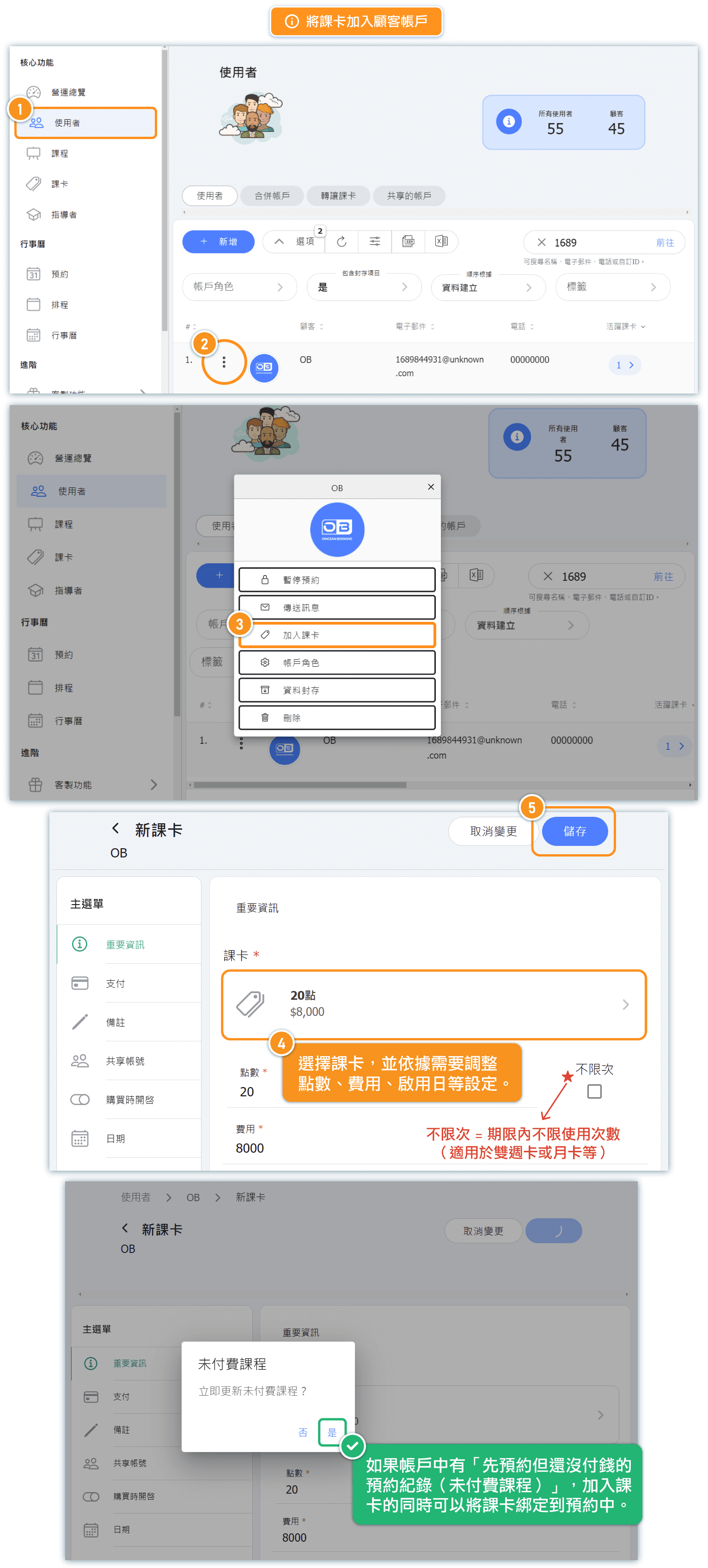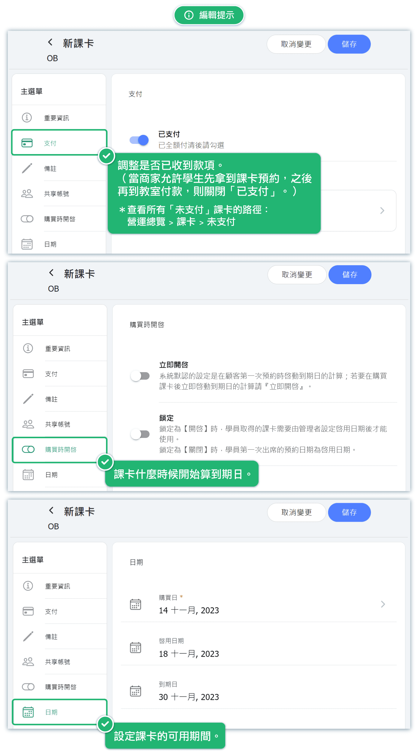 - 【Payment】: Adjust whether the payment has been received. (When the business allows customers to obtain a pass and make bookings before paying in person at the studio, please turn off “Paid”.) *To view all “Unpaid” class passes: Dashboard > Passes > Unpaid