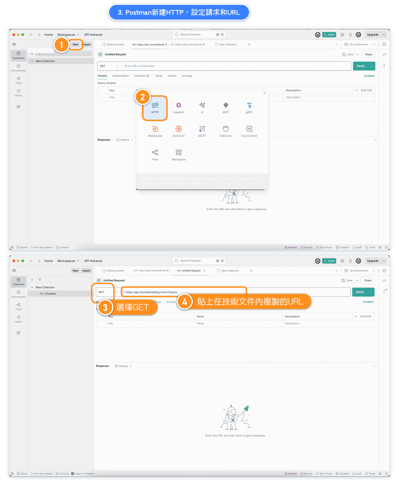 Add new HTTP, choose GET, paste URL you copied from API Documentation.