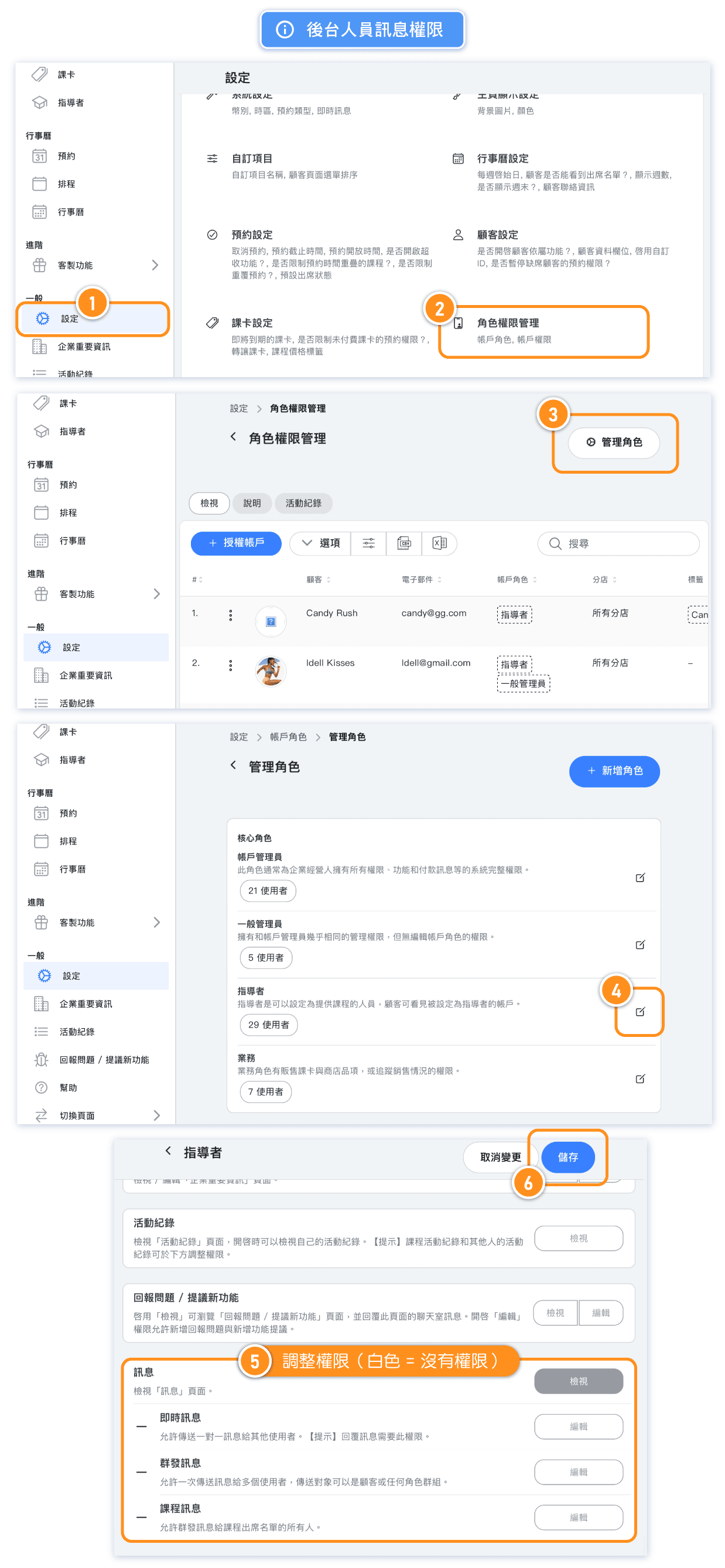 Admin can send one-on-one or group messages, but messaging permissions may vary based on their role in the booking system, and they may be restricted from sending messages. These permissions can be adjusted in the 'Roles & Permissions' section of the admin side 'Settings' page.