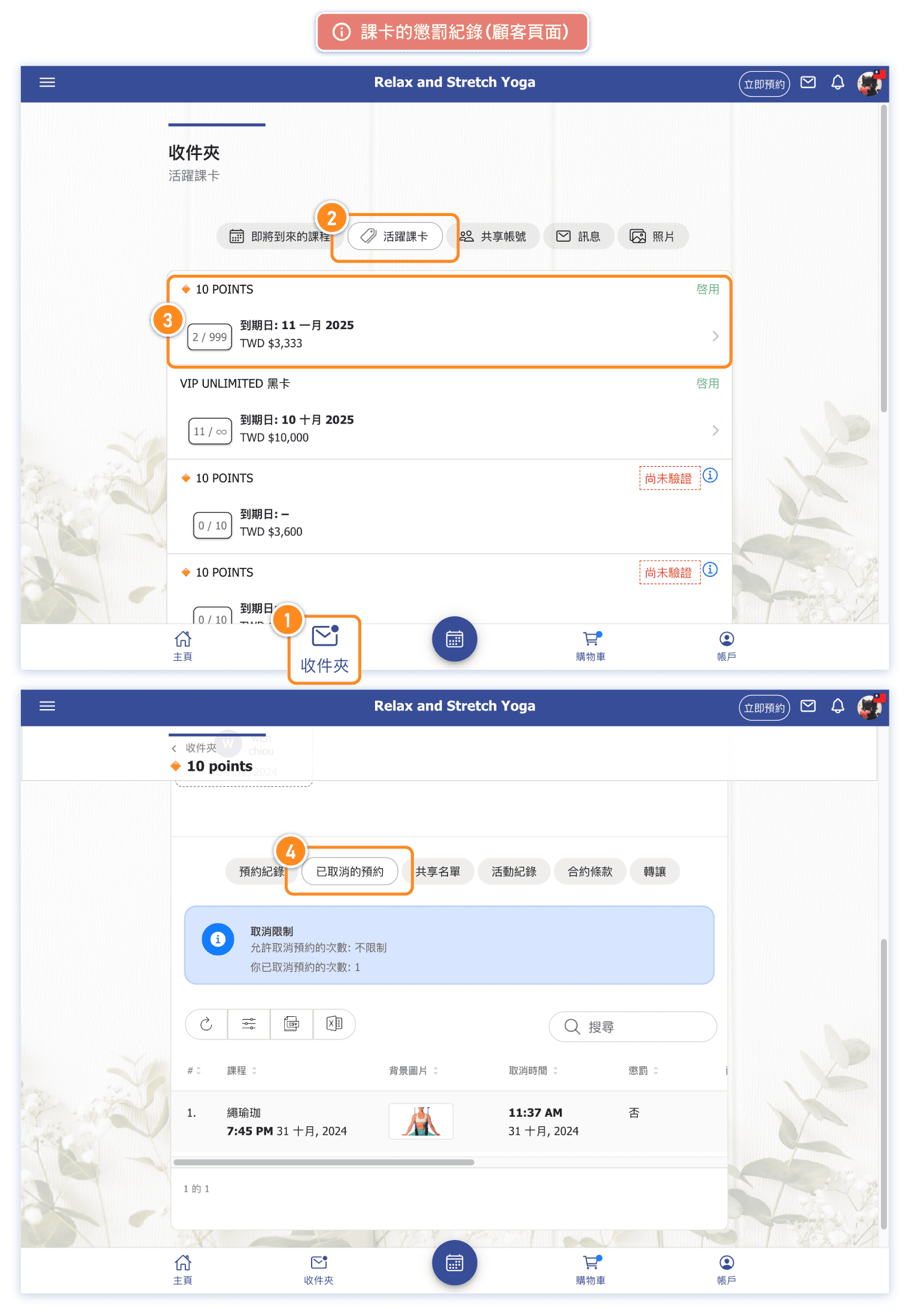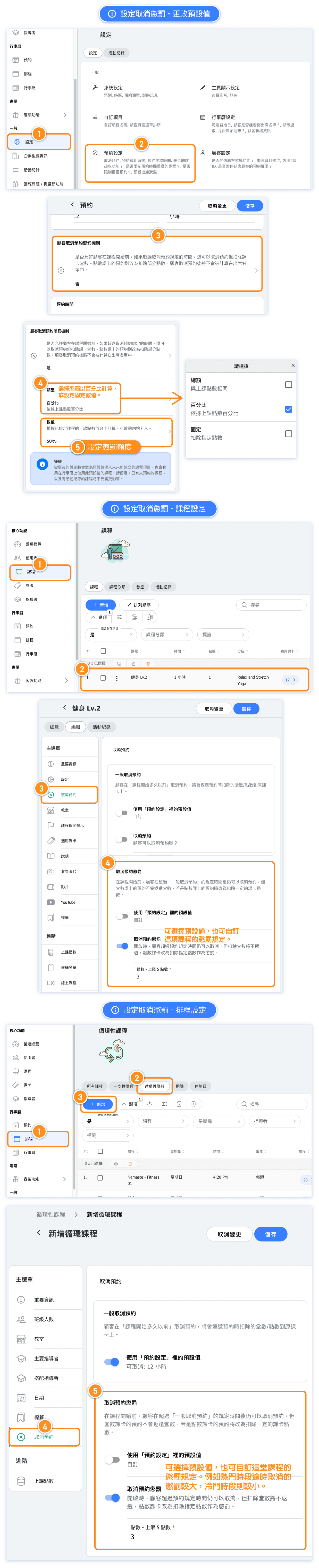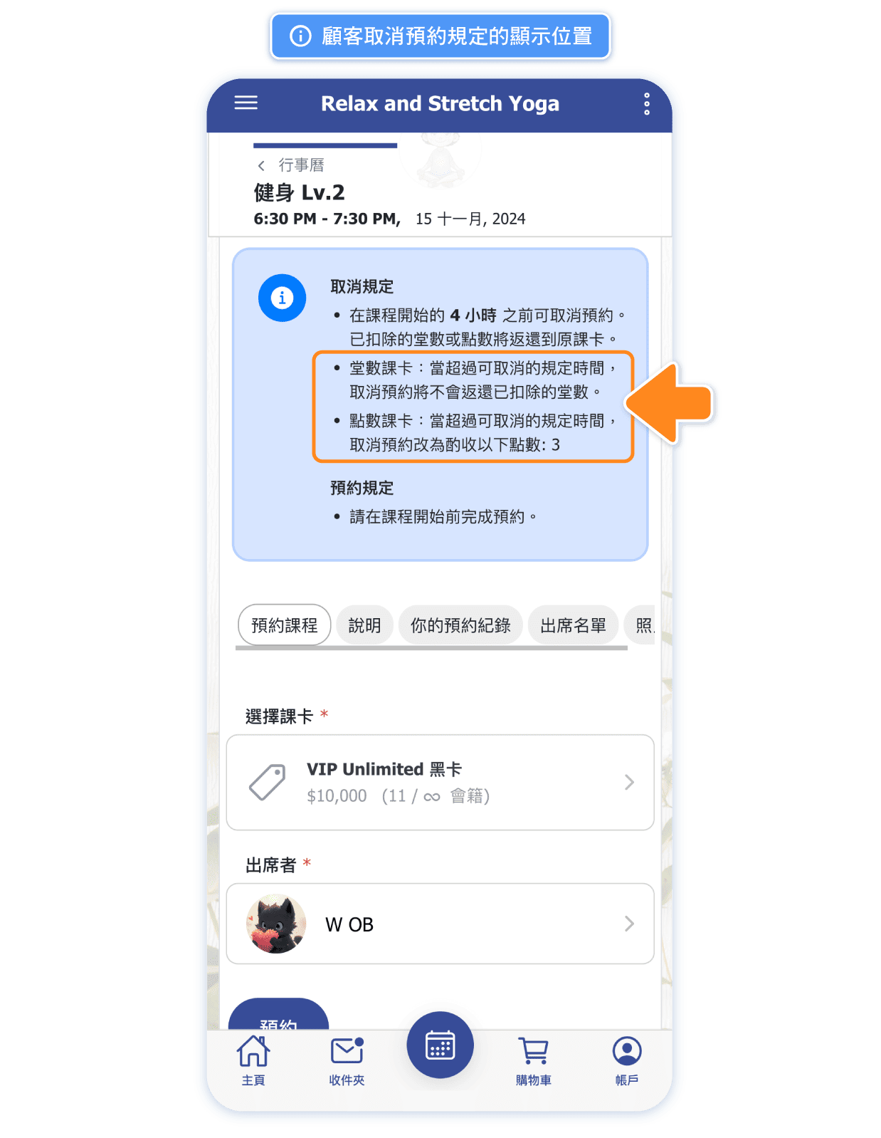 Regular Cancellation: During this period, customers canceling their bookings will have the deducted sessions or points returned.