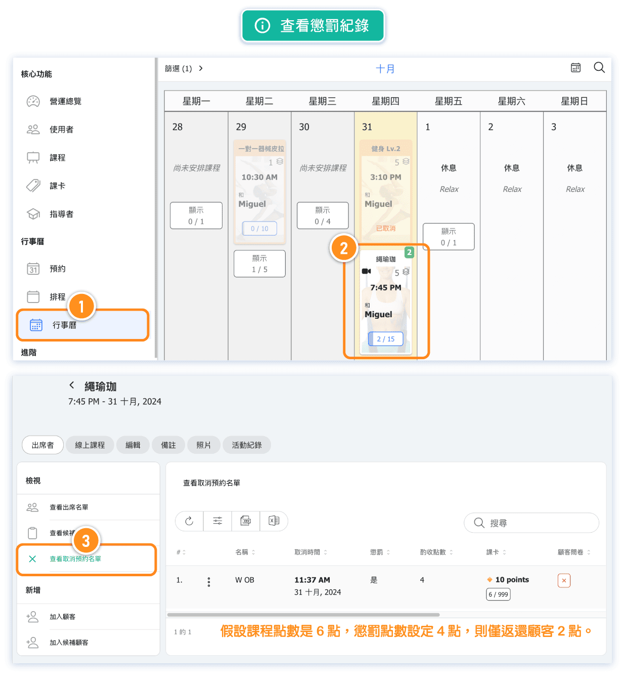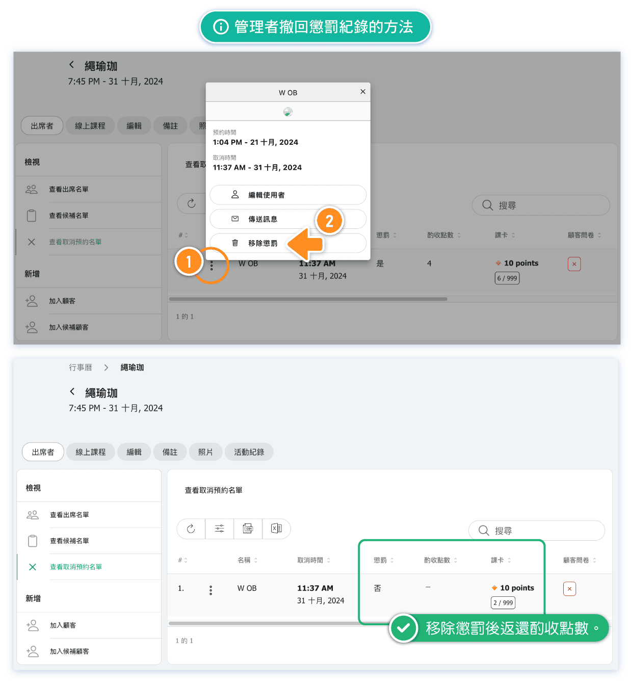 For example, if a customer was originally penalized 2 points for a late cancellation and the admin later changes it to 3 points, the customer’s penalty record will update to reflect a deduction of 3 points.