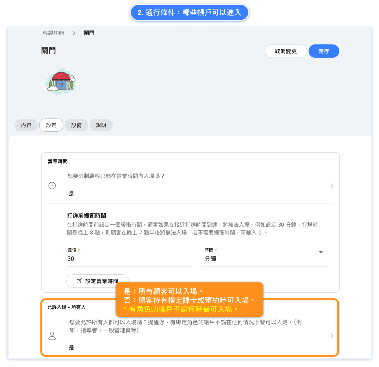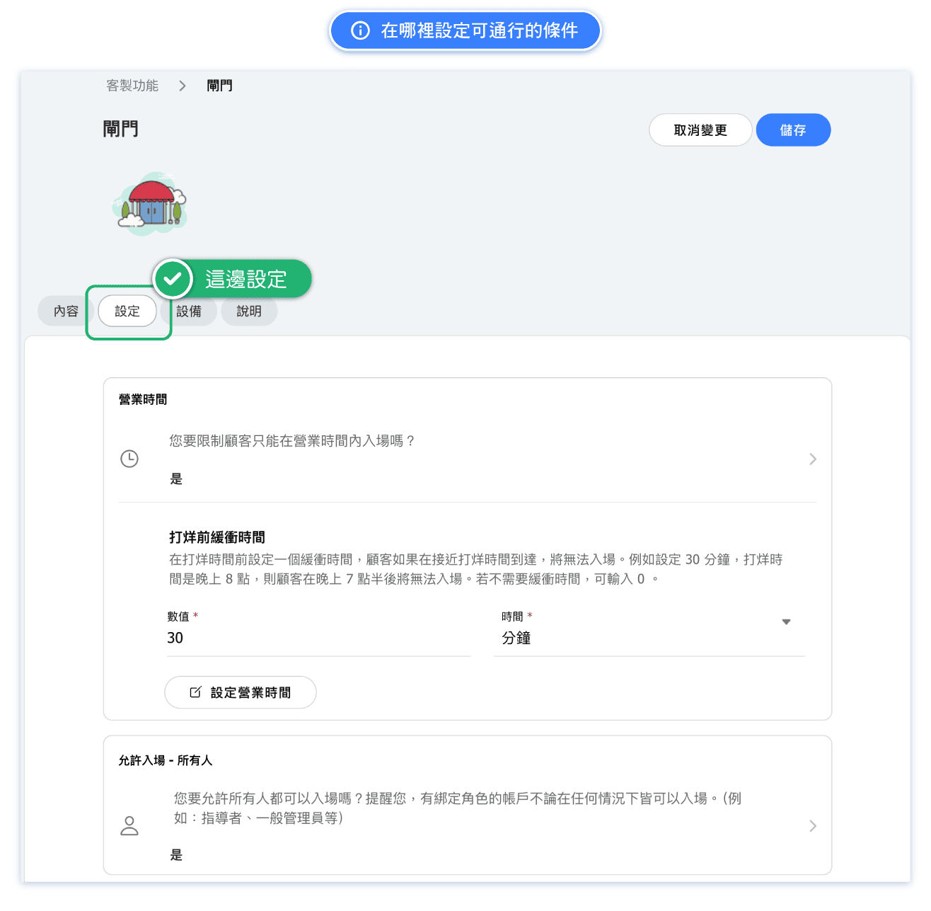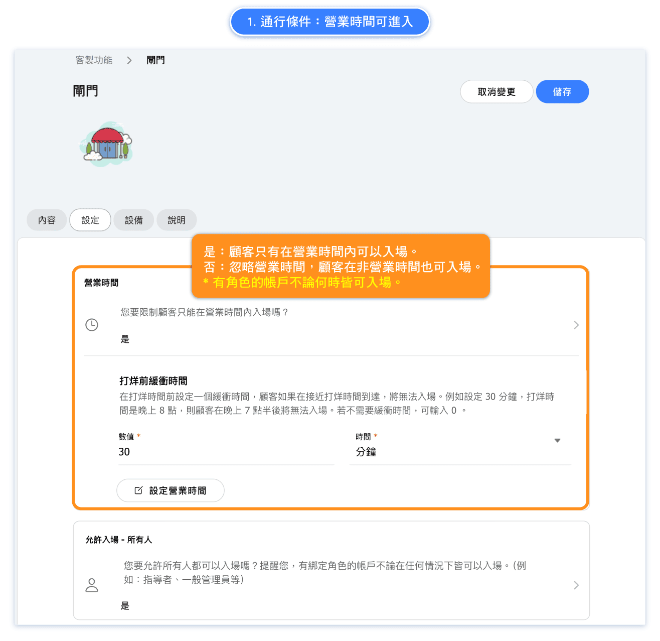 This feature allows you to restrict access close to closing time. For instance, if you don’t want customers to enter within 30 minutes before closing, set the buffer time to "30 minutes."