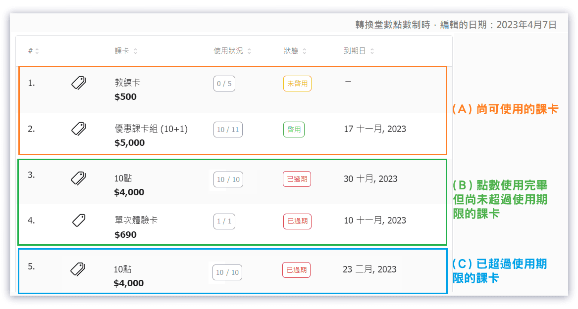 🔔 Note: If financial consistency is not a concern, adjustments are only needed for "(A) active passes" and "(B) passes with no points left but not yet expired" held by customers. "(C) Passes expiration dates have passed" no need to be adjusted.