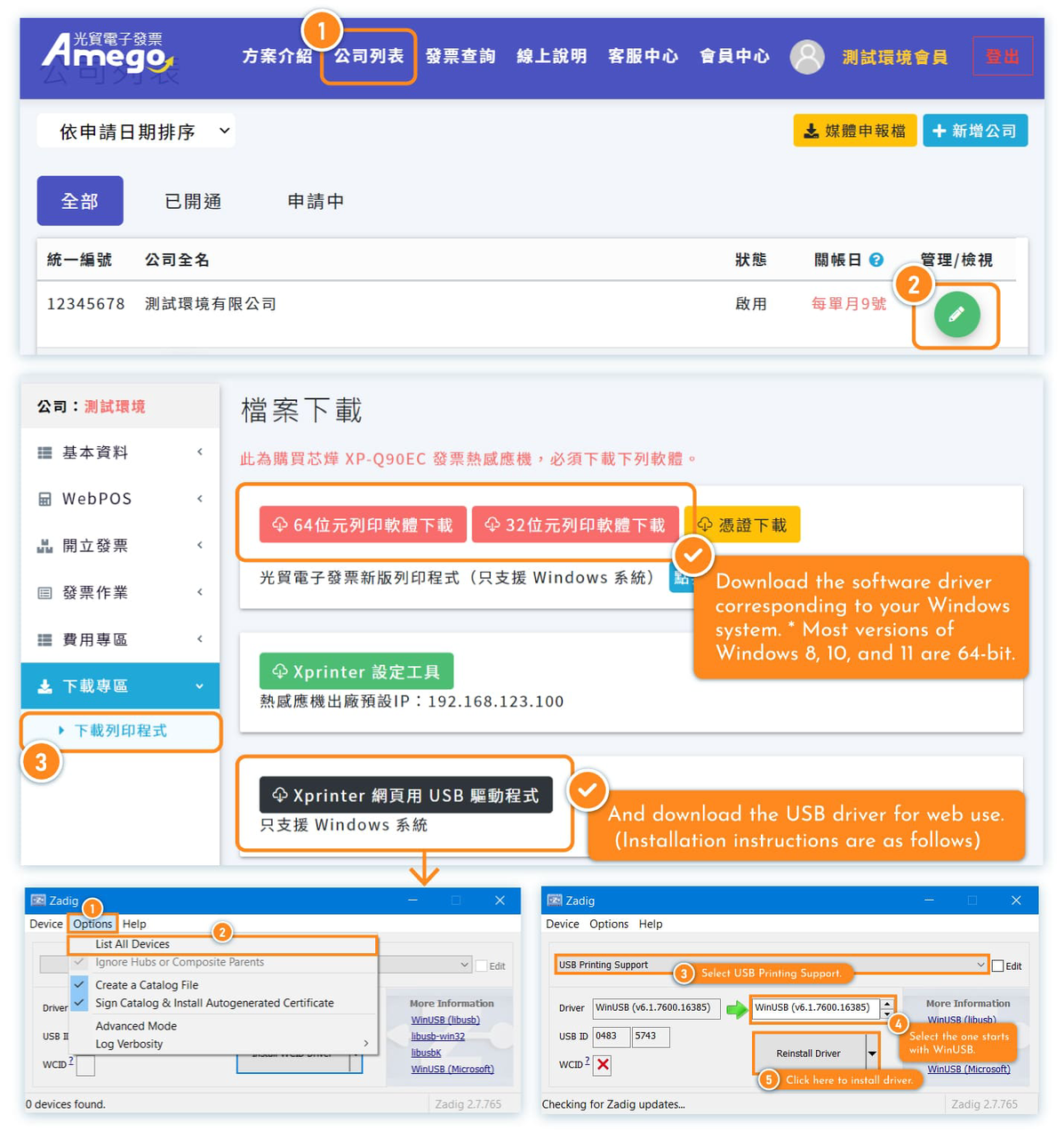 - If you are using a Windows system device, please log in to Amego website and download the required 2 drivers: printer driver and USB driver for the web. (Drivers are not required for mac.)