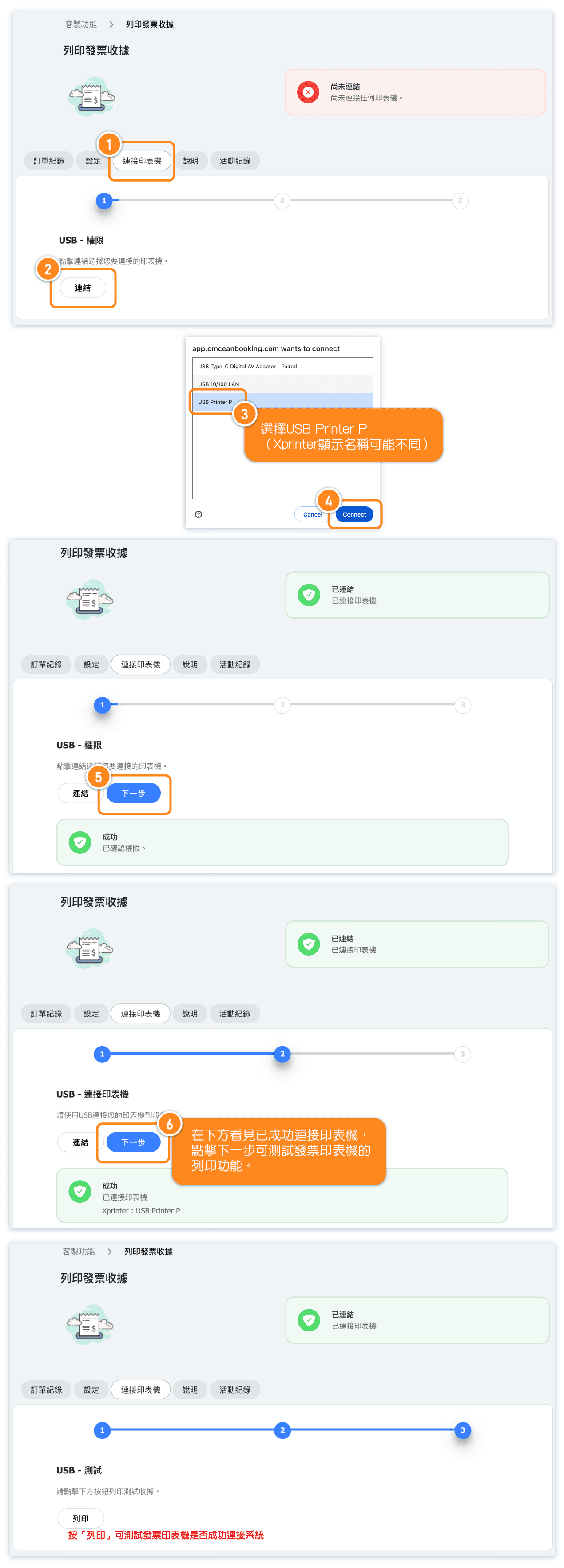 - Go to the "Printer Setup" page, click "Connect" to confirm that the OB system has detected your printer. You can click the test button in step 3 to print a test receipt, indicating that the connection is successful.