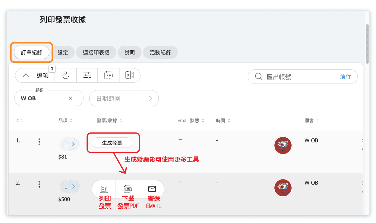 Clicking "Generate Receipt" under the "Purchases" tab, the system will send the purchase details to Amego (光貿電子發票). Once the receipt is generated, Amego will send the receipt data back to the system. The business can then choose to print the receipt, or download it as the PDF version, or send the receipt to the customer via email.
