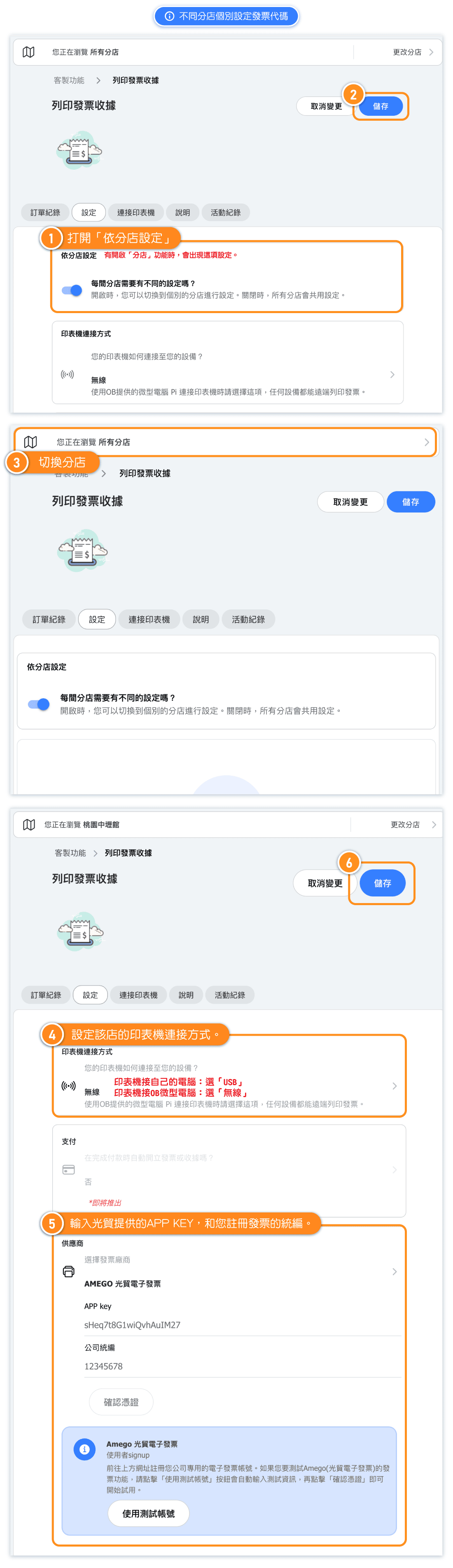 The APP Key is your company's dedicated code for using Amego e-invoices. Please register an account with Amego, enter your company information, and after successful registration, confirm your company's App Key. Return to the OB system and enter the App Key along with your Business ID number (tax ID number). Link: Electronic Invoice Registration Process + Adding Company Information: https://invoice.amego.tw/info_detail