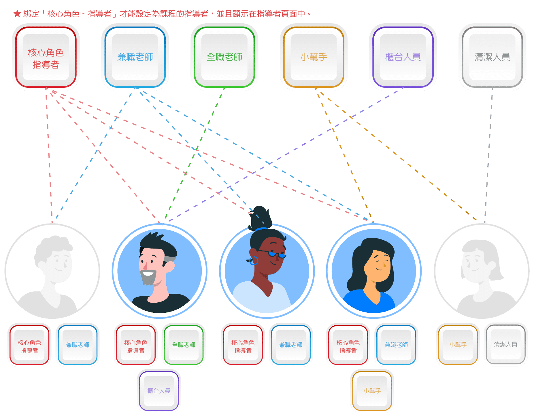 - Authorized Roles: Core Role - Instructor (Remove all permissions) + Custom "Part-time Teacher" Role.*Binding to the "Core Role - Instructor" allows setting as a class instructor and display on the instructor page.