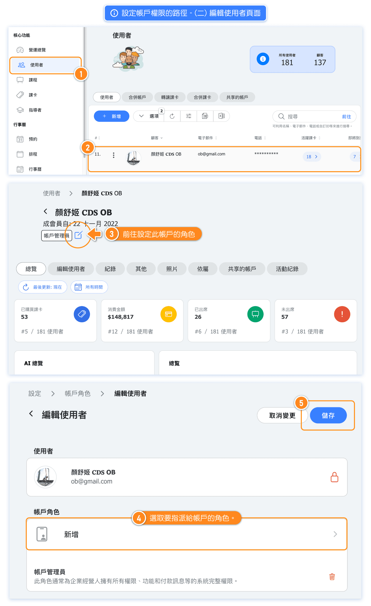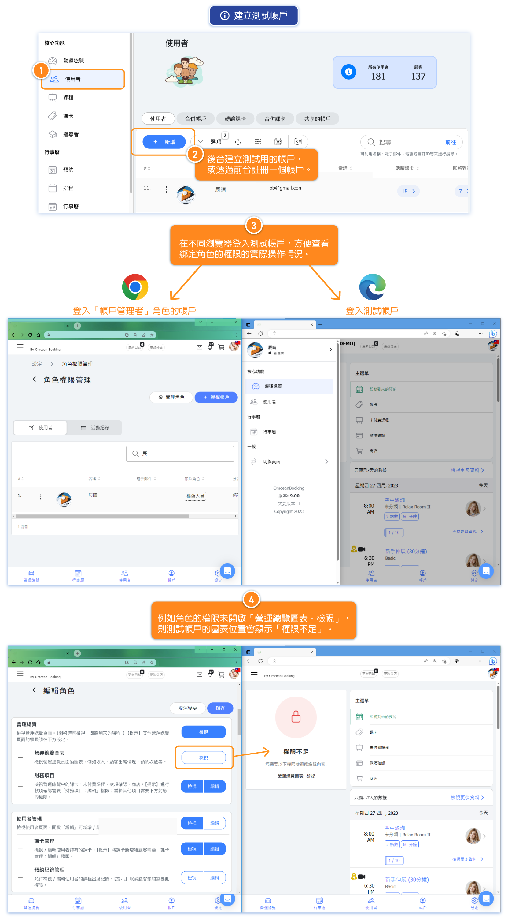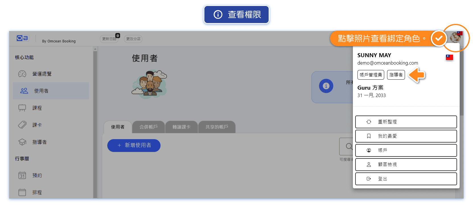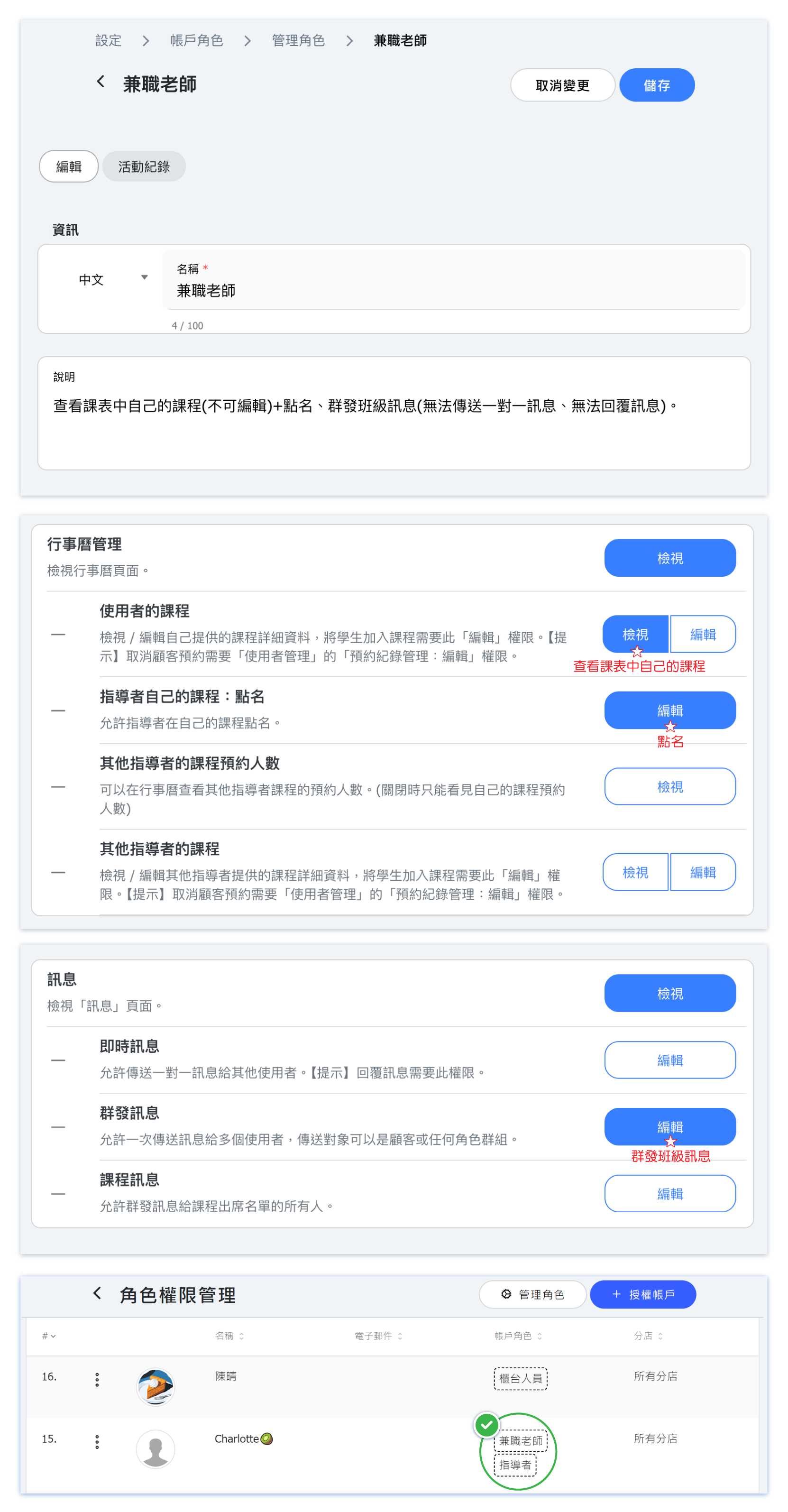 "Role and Permission" is a job permission management system that replaces the previous account permission settings. In addition to the default "core roles" of administrators and instructors, it also allows for "custom roles" to assign and manage permissions for each staff member based on their position and duties (e.g., assistants, part-time teachers, front desk staff, janitors, etc.).