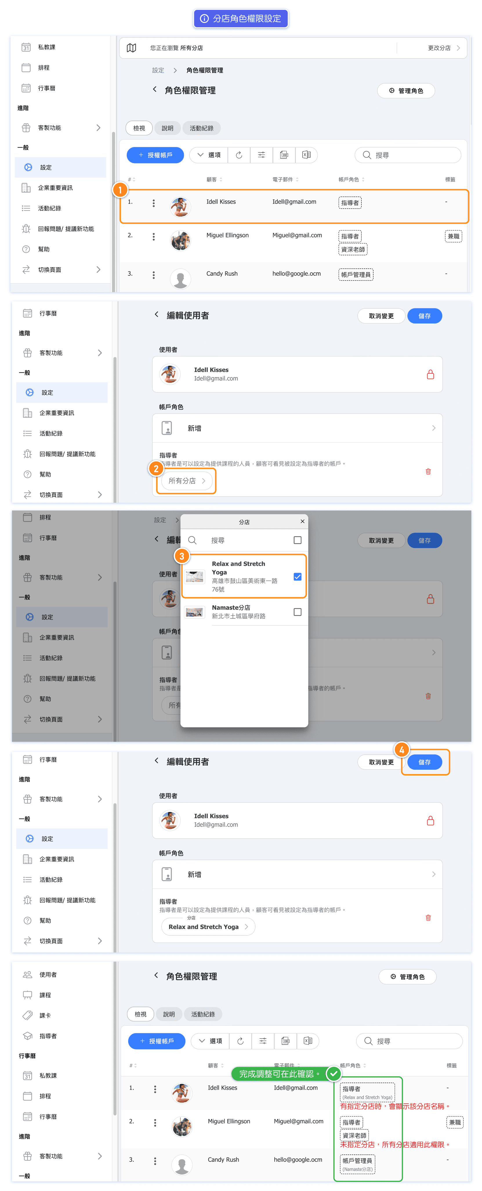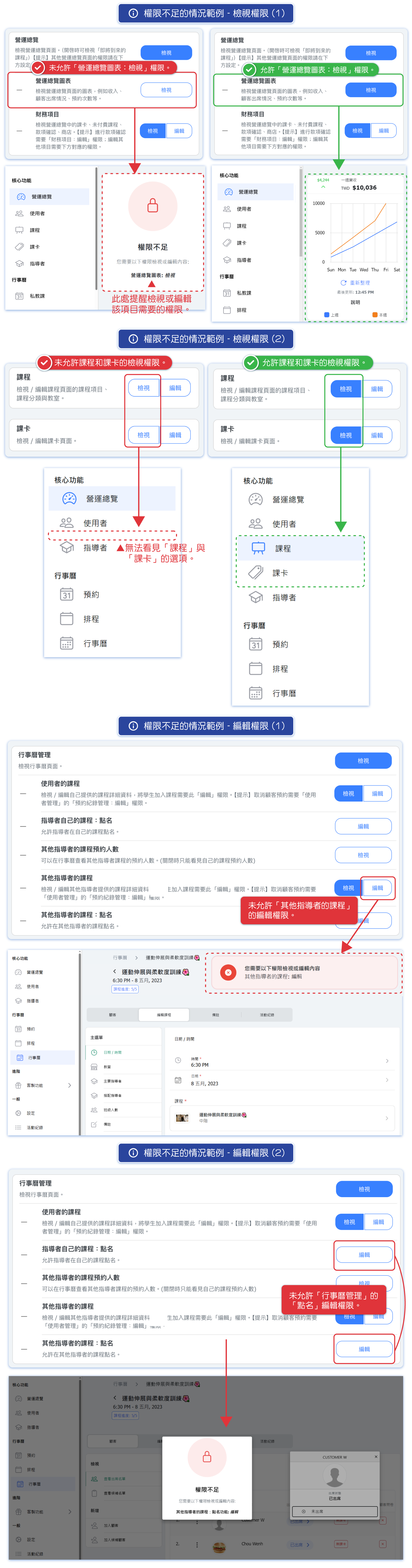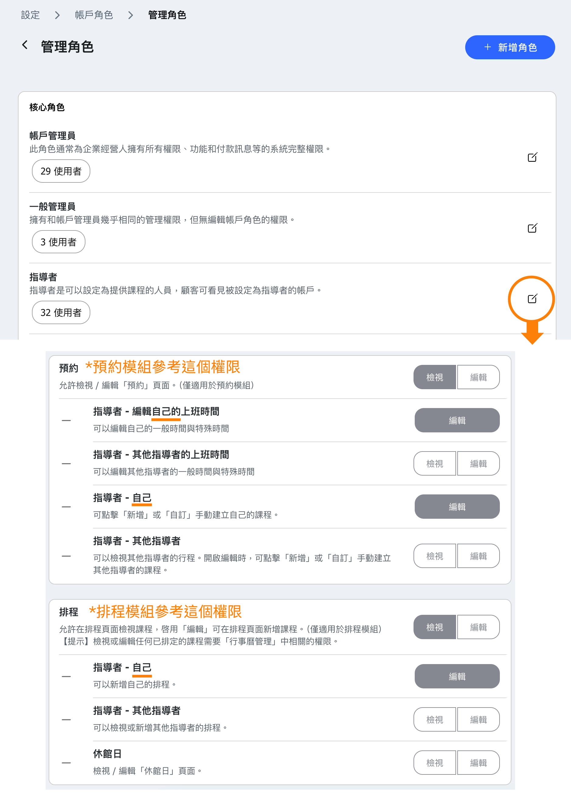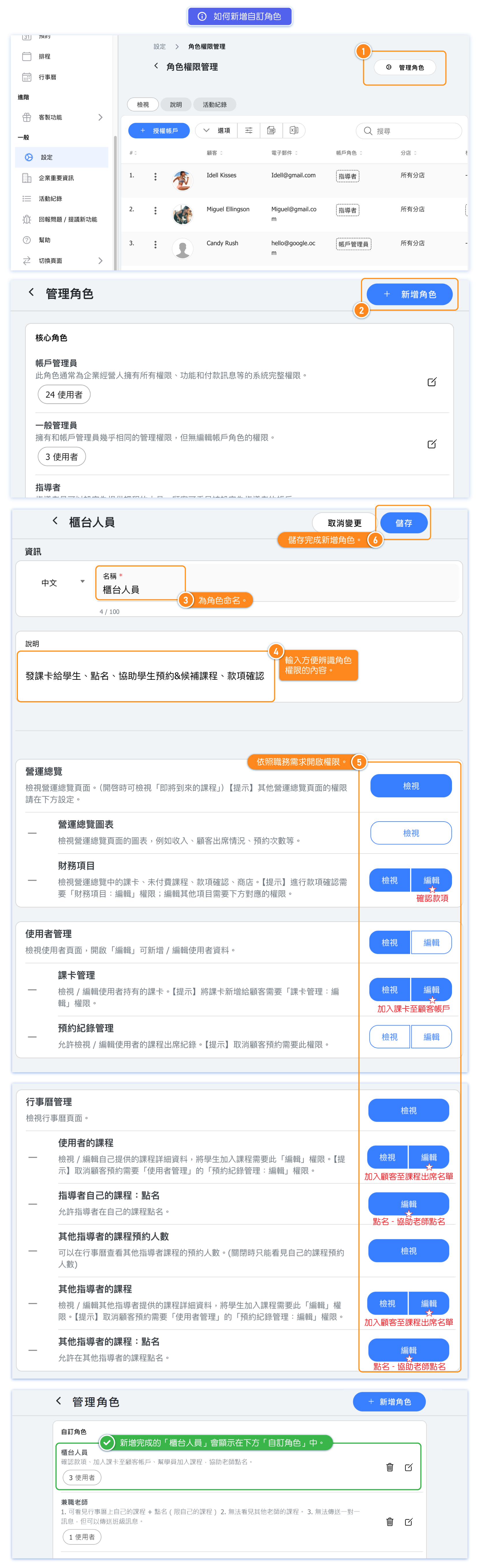 💡 Tip: If each instructor at the business has different permissions, you can set the core role "Instructor" with minimal permissions and then create multiple custom roles with different permissions. Authorize according to the instructor's permissions "Core Role - Instructor" + "Different Roles".