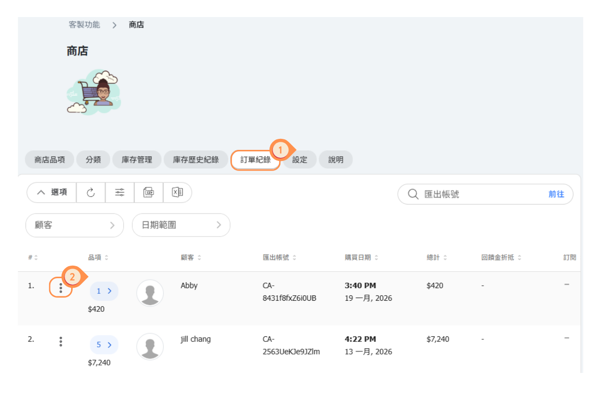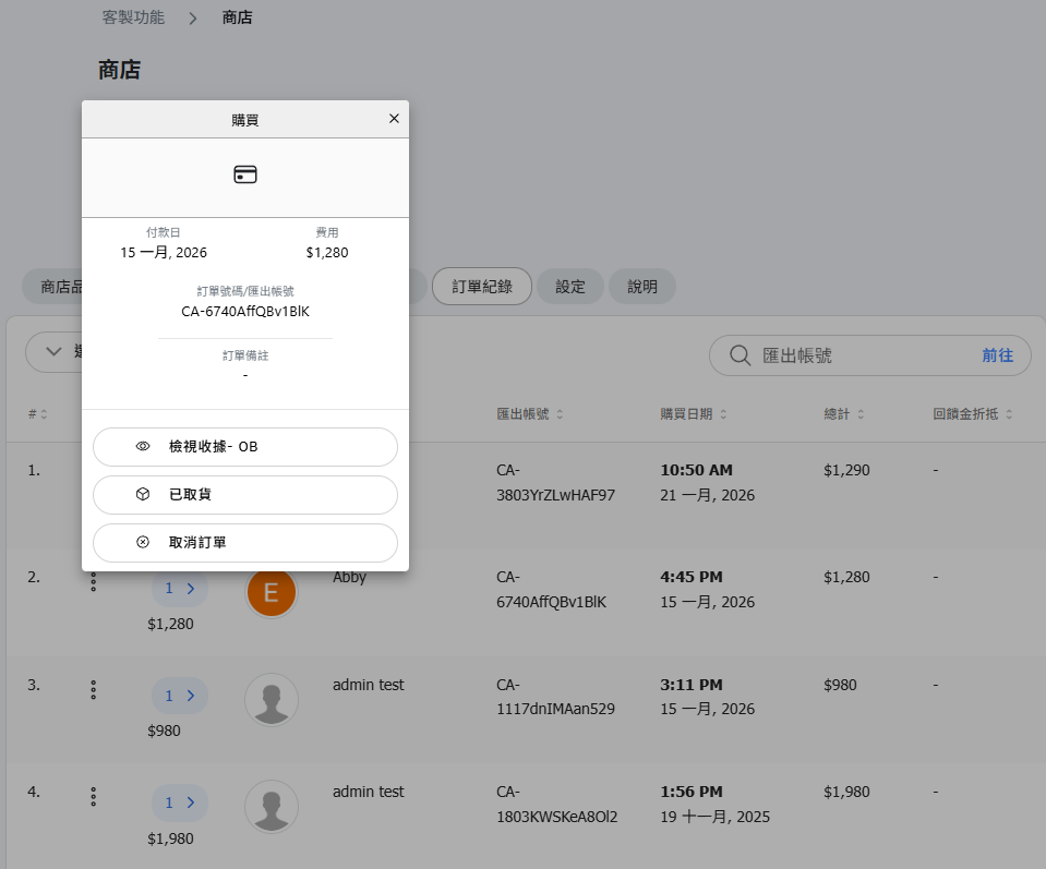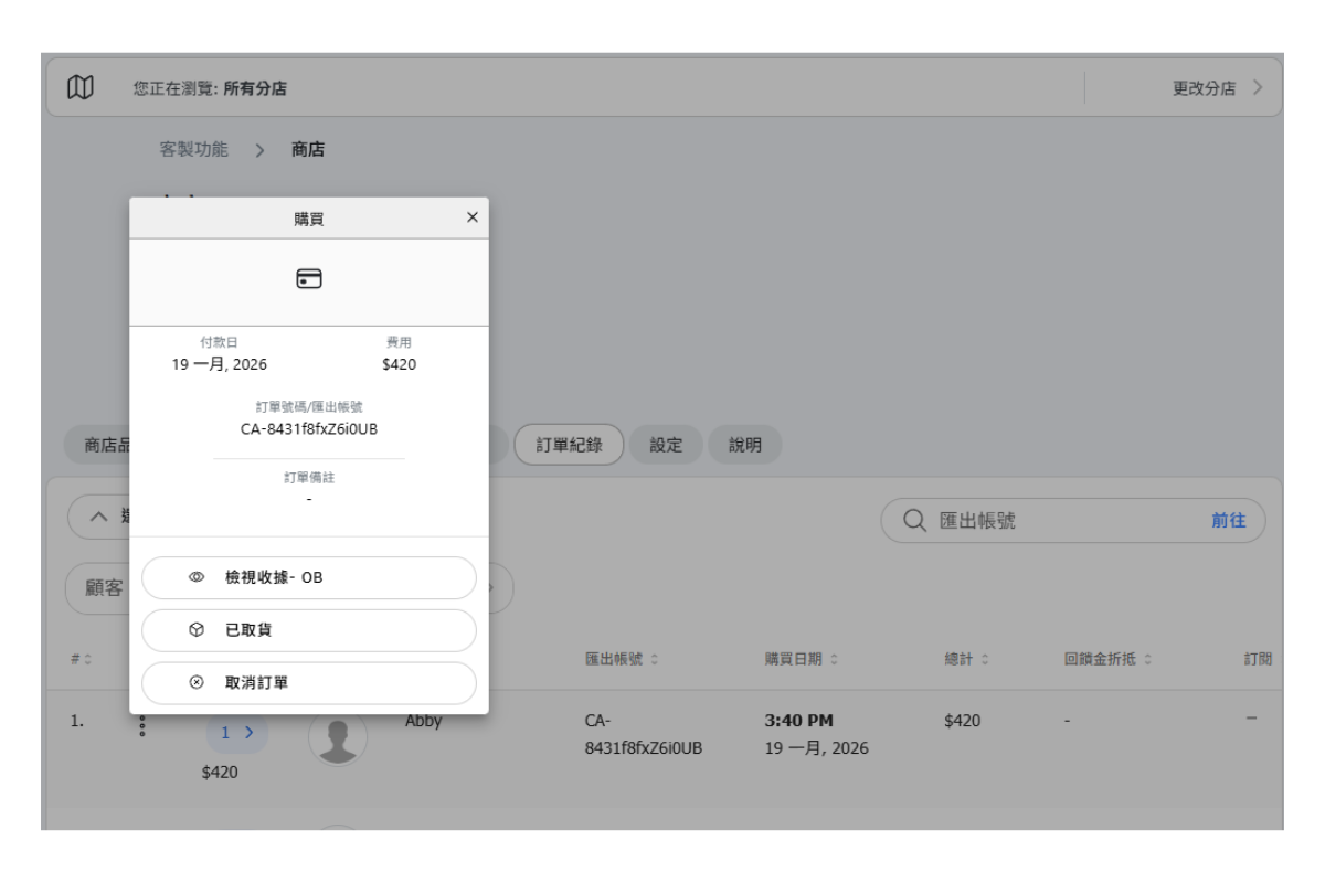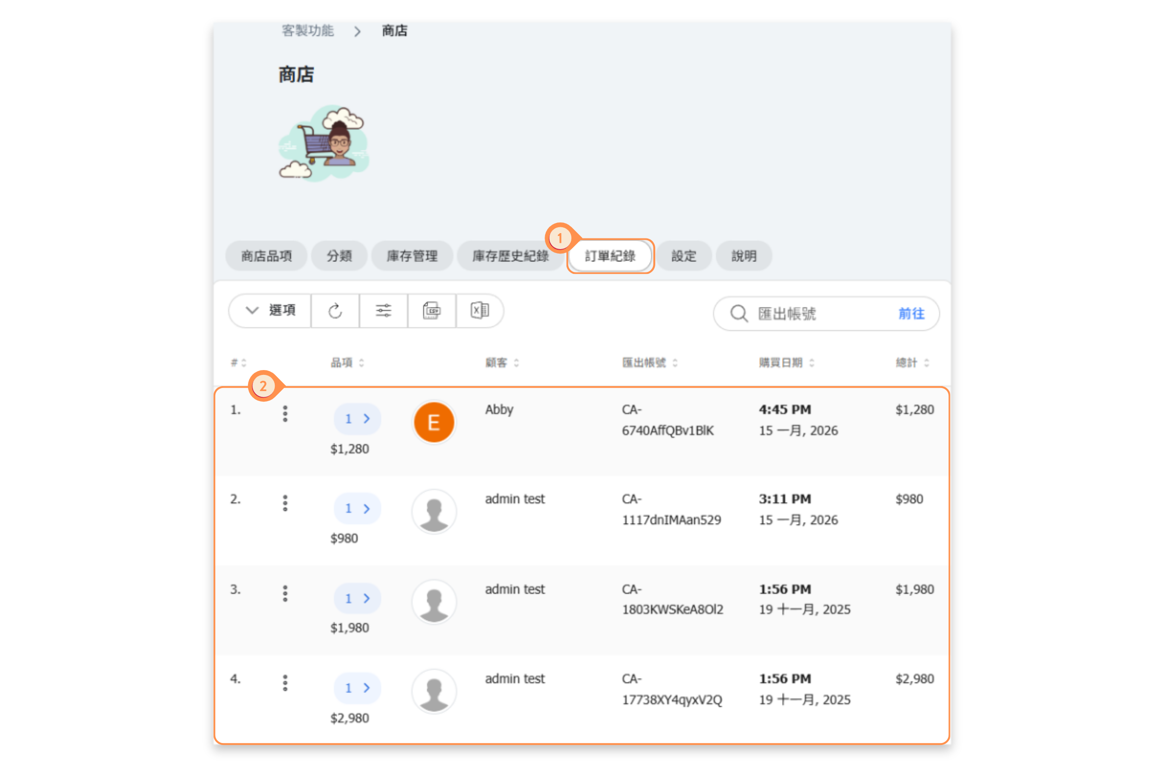 The Purchases tab gives you a complete view of all customer orders in your shop.