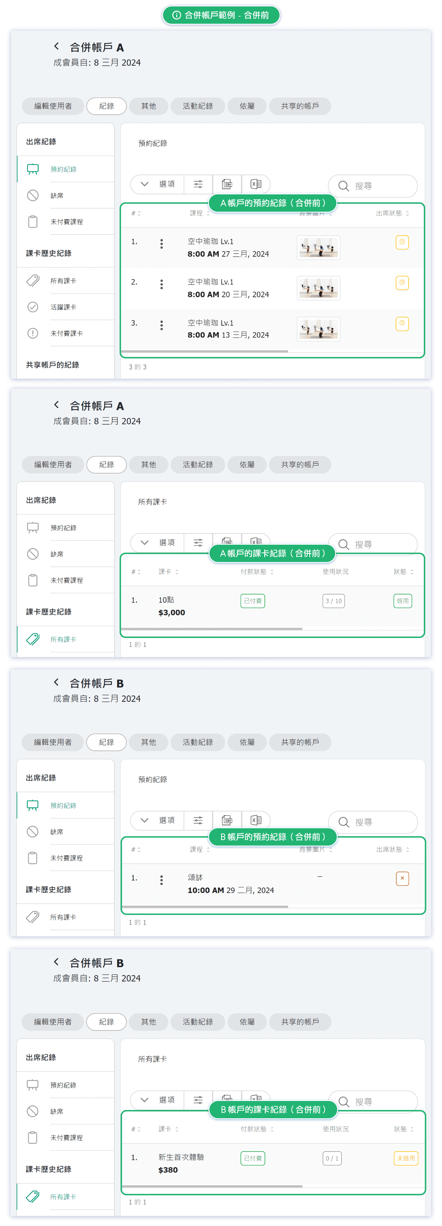 - Reservation history, pass History, and account role(s) from the account being removed will be transferred to the account being kept.