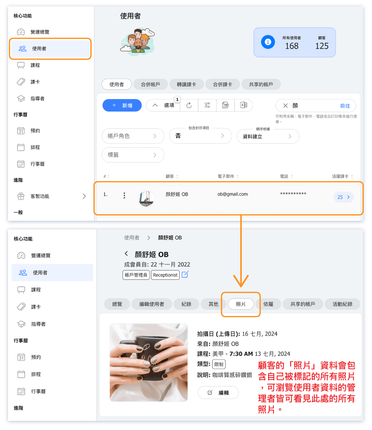 In addition to viewing photos in the course details on the "Calendar," administrators can also view photos tagged with a specific user in the "User" information.