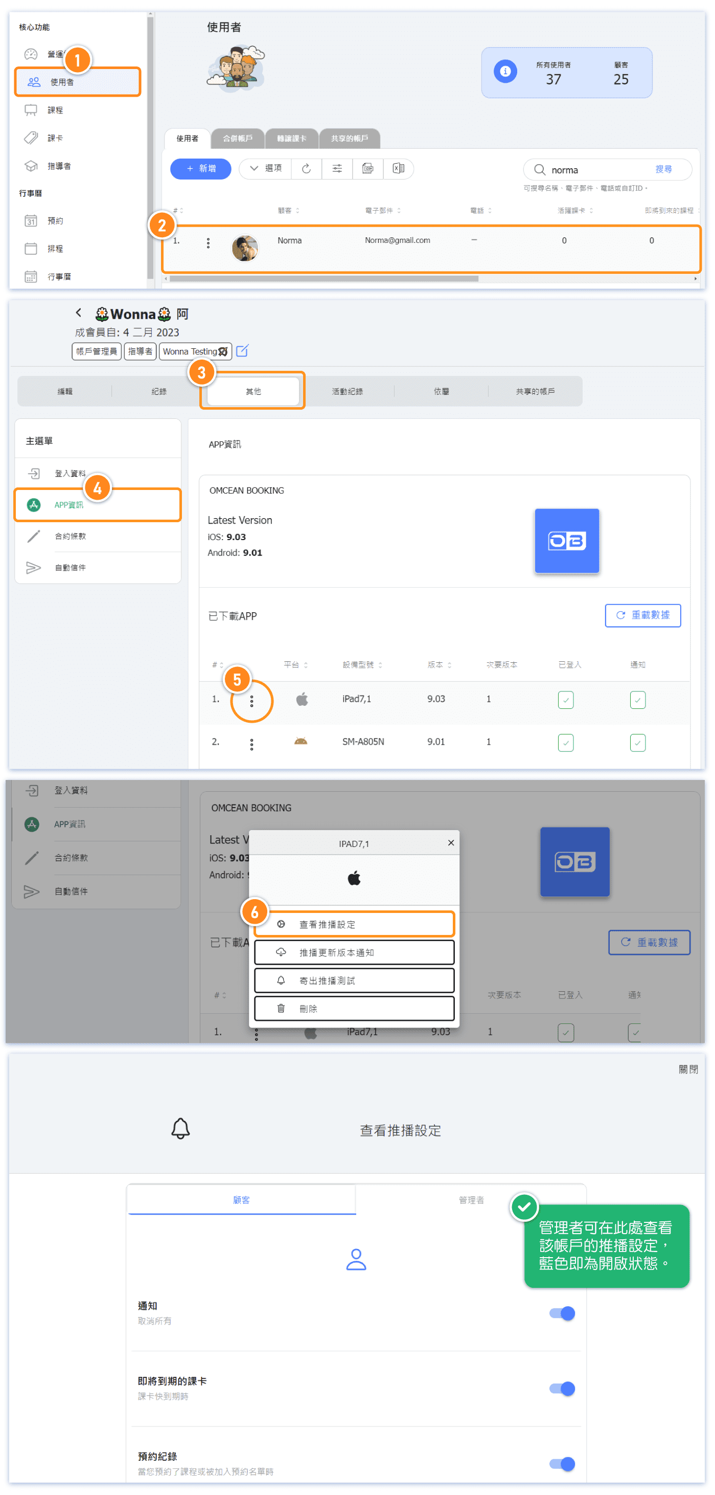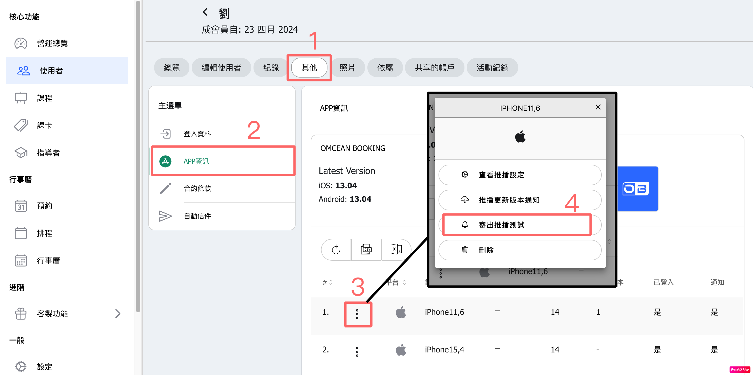 在「使用者編輯 ⭢ 其他 ⭢ APP資訊」找到顧客已經登入的設備,點擊三個點即可找到「寄出推播測試」的按鈕。