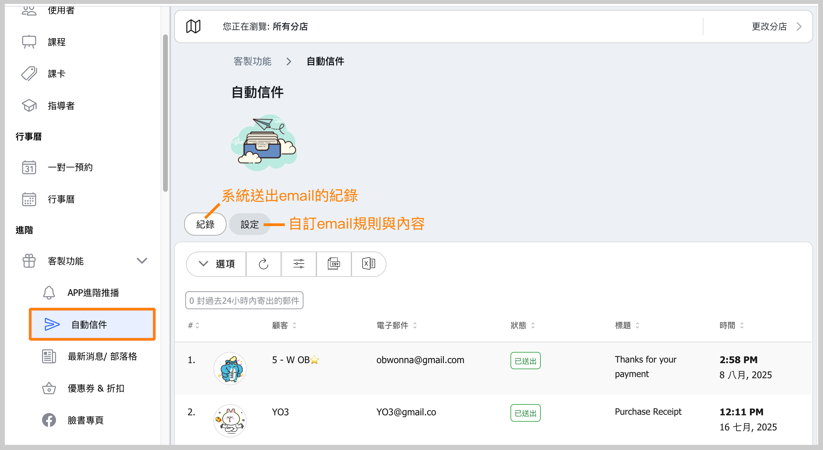 自動信件功能讓您的系統在特定事件發生時自動發送電子郵件通知給客戶和管理員。這些郵件讓所有人隨時了解預約、課卡狀態和其他重要更新。