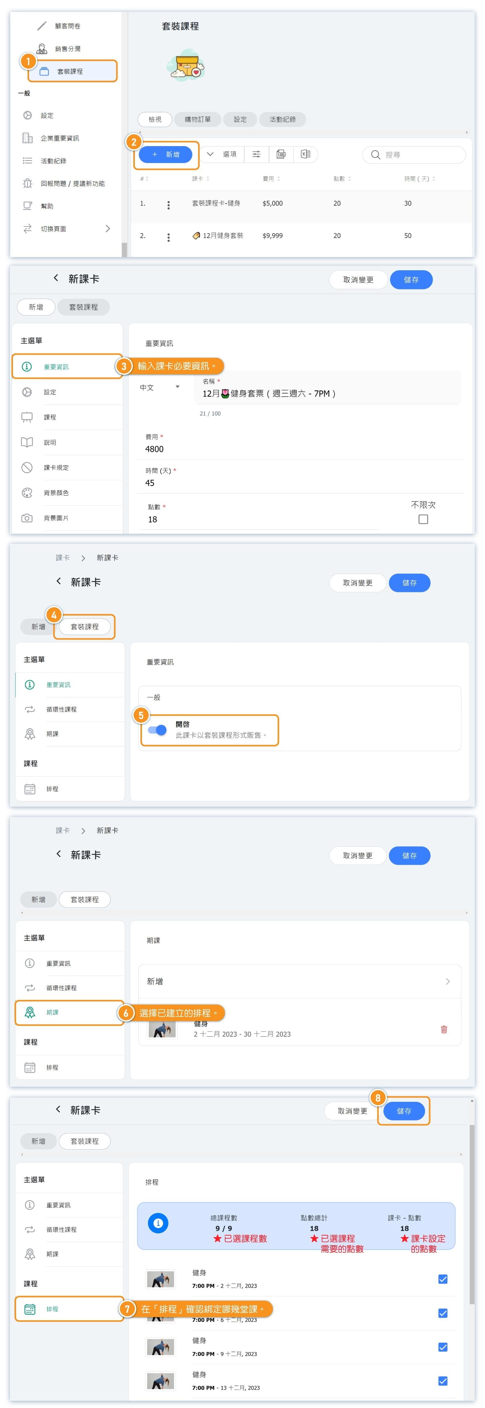 「套裝課程」適合想將多堂課程打包販售的商家,並希望顧客在購買課卡後,系統能自動為顧客預約綁定的課程。