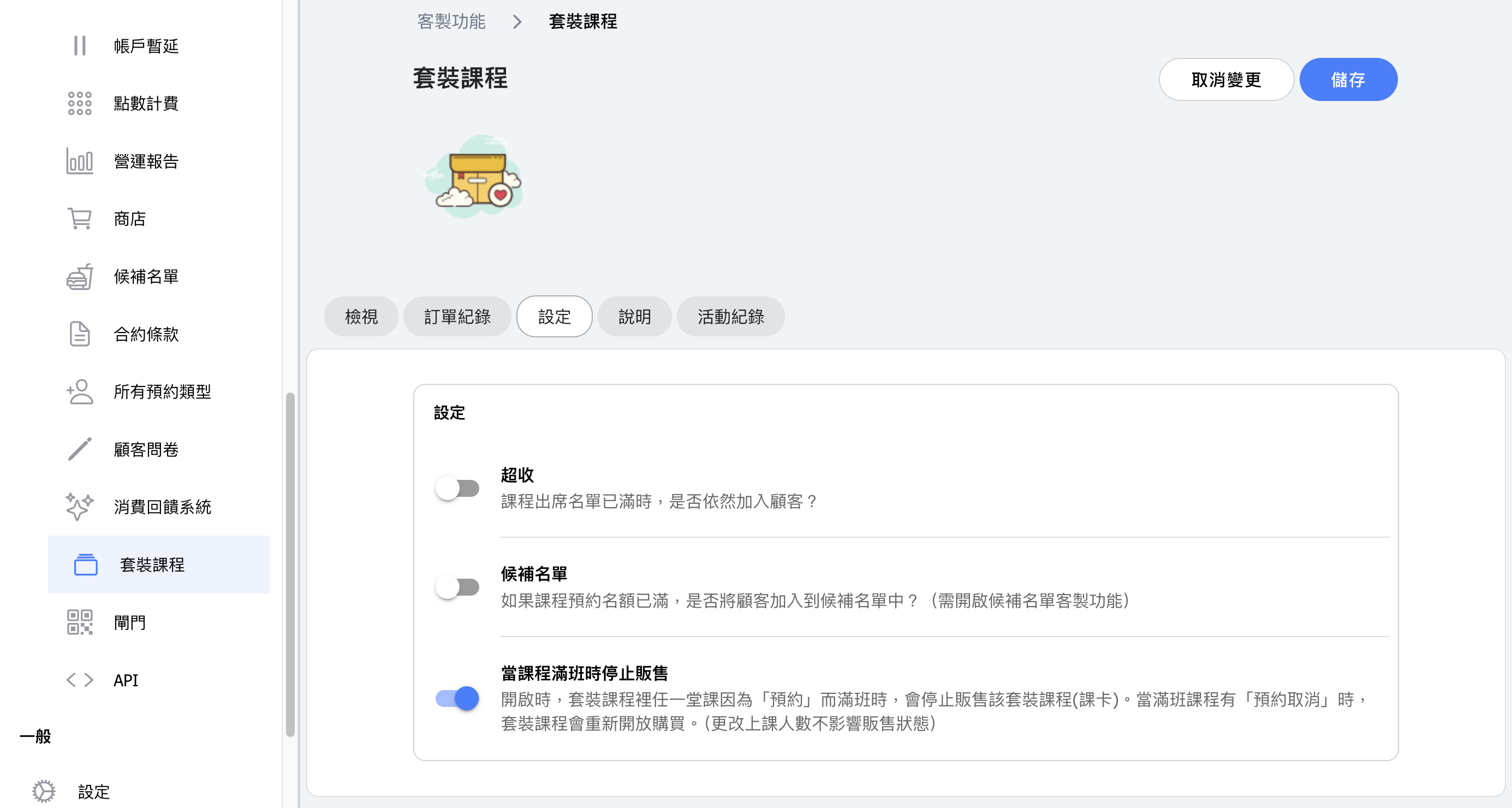 可利用套裝課程「設定」的「當滿班時停止販售」來控制販售情況。
