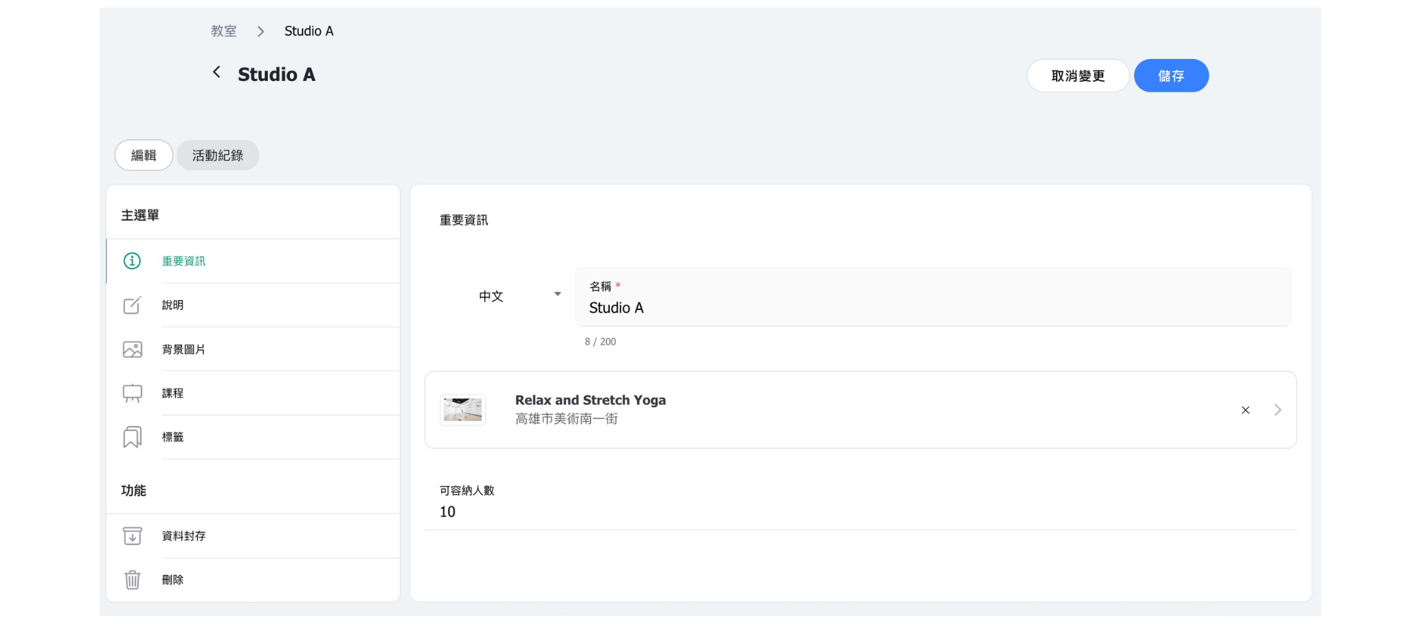 🔹 名稱 - 顯示給客戶和員工的教室名稱(例如「A教室」、「瑜伽室」、「大廳」)。使用語言選擇器輸入英文和中文名稱。最多200個字元。