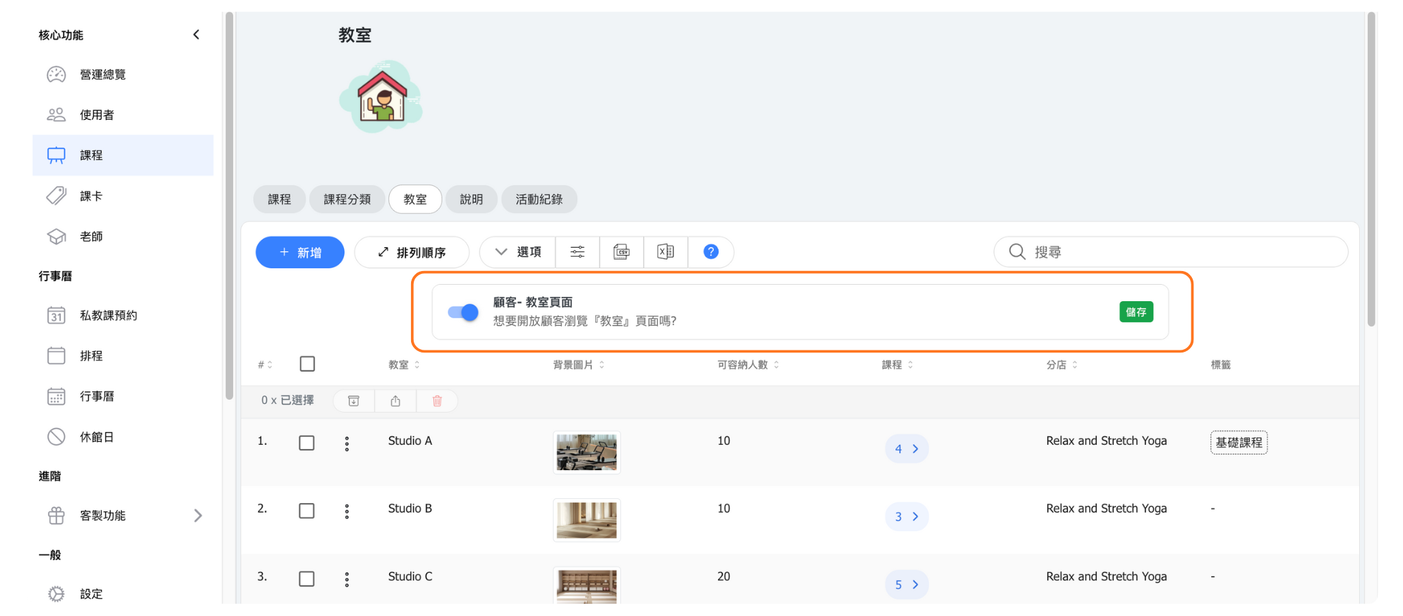🔹 切換此設定以向客戶顯示專屬的「教室」頁面。