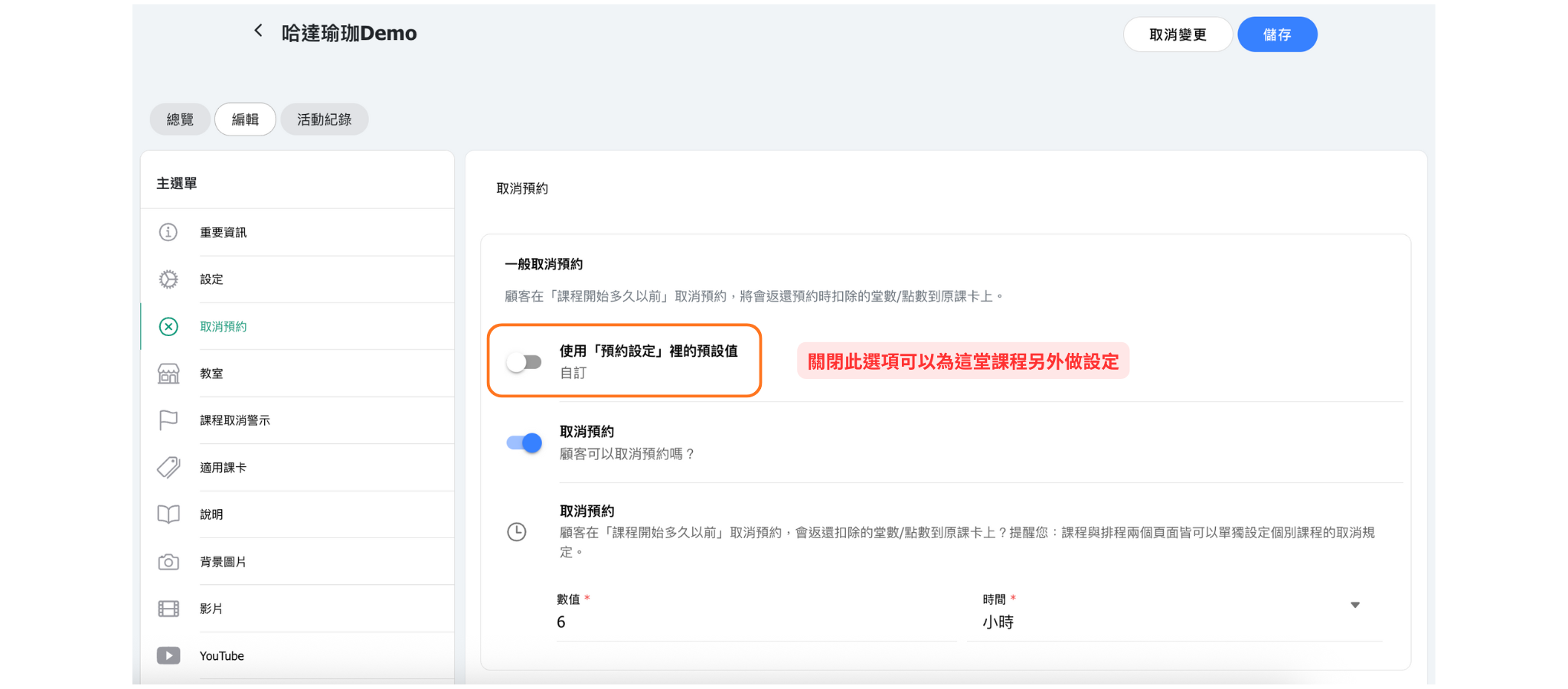- 預約取消 - 允許或禁止客戶取消預約。設定時間限制(例如「課程前24小時」)。