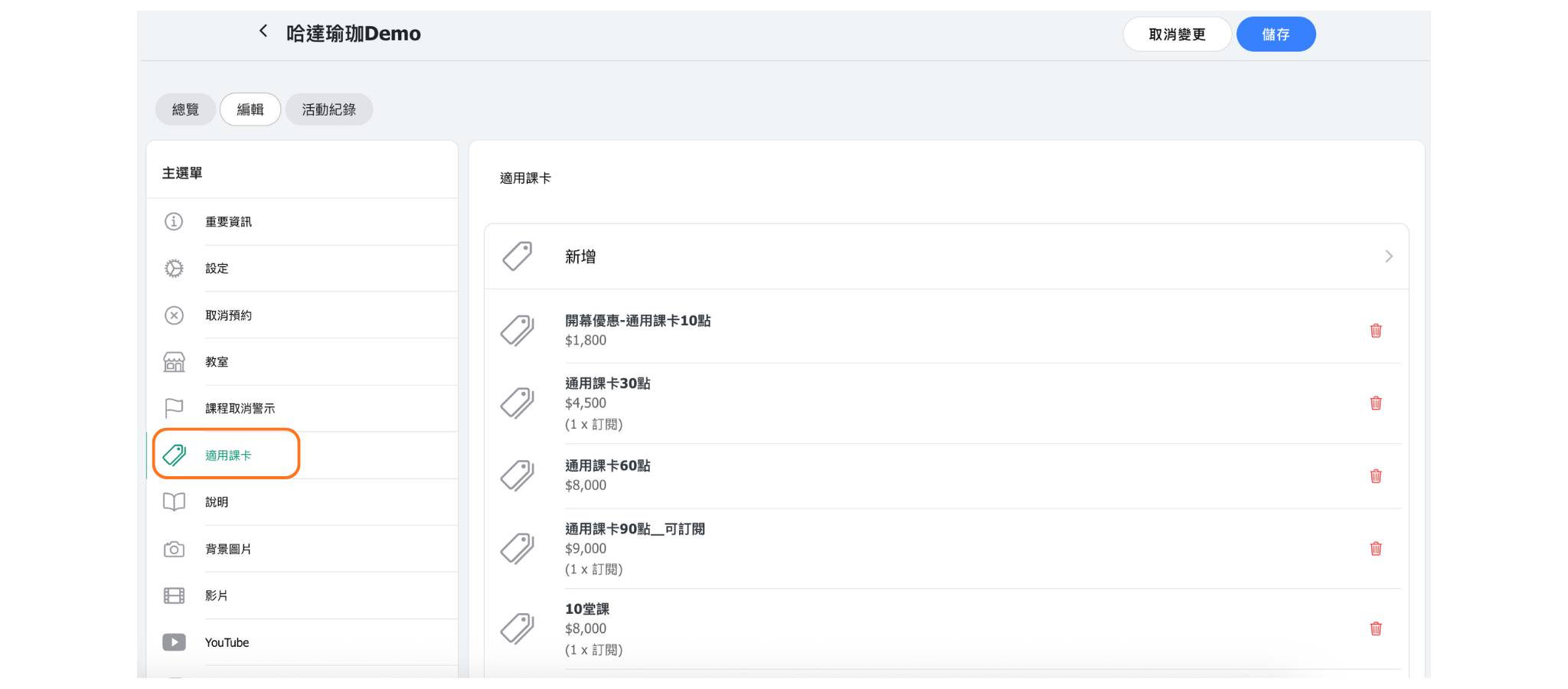🔹 點擊新增以連結客戶可用於此課程的課卡。