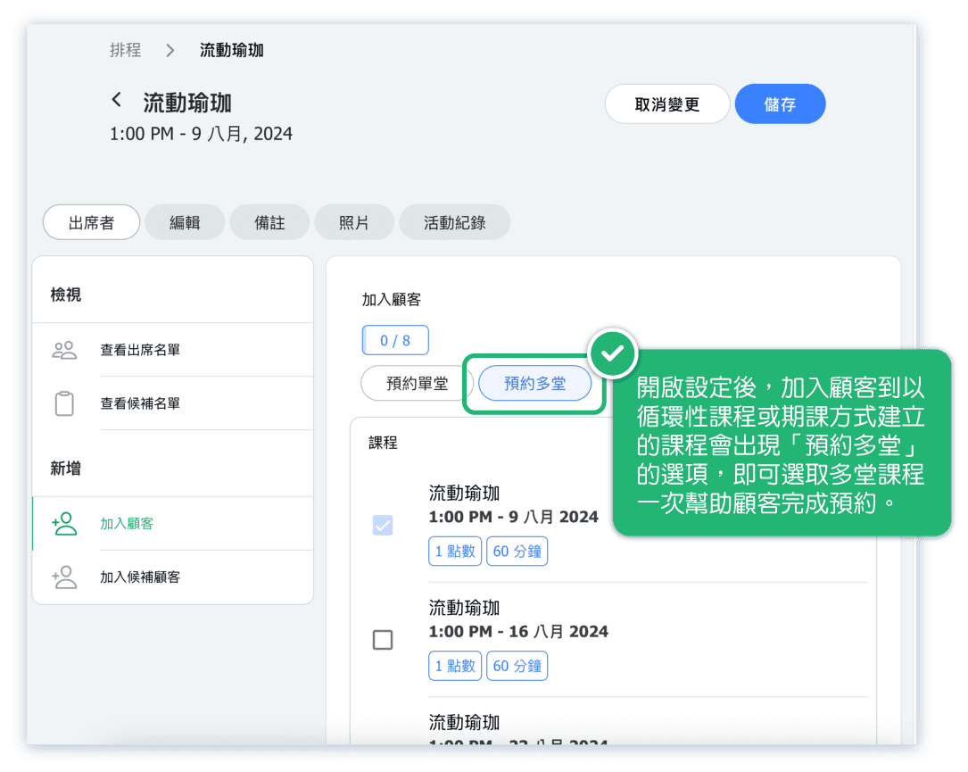 開啟設定中「預約設定」的「一次預約多堂課程」後,您與您的顧客將可以一次預約多堂循環課程或期課,更迅速地安排課程預約。