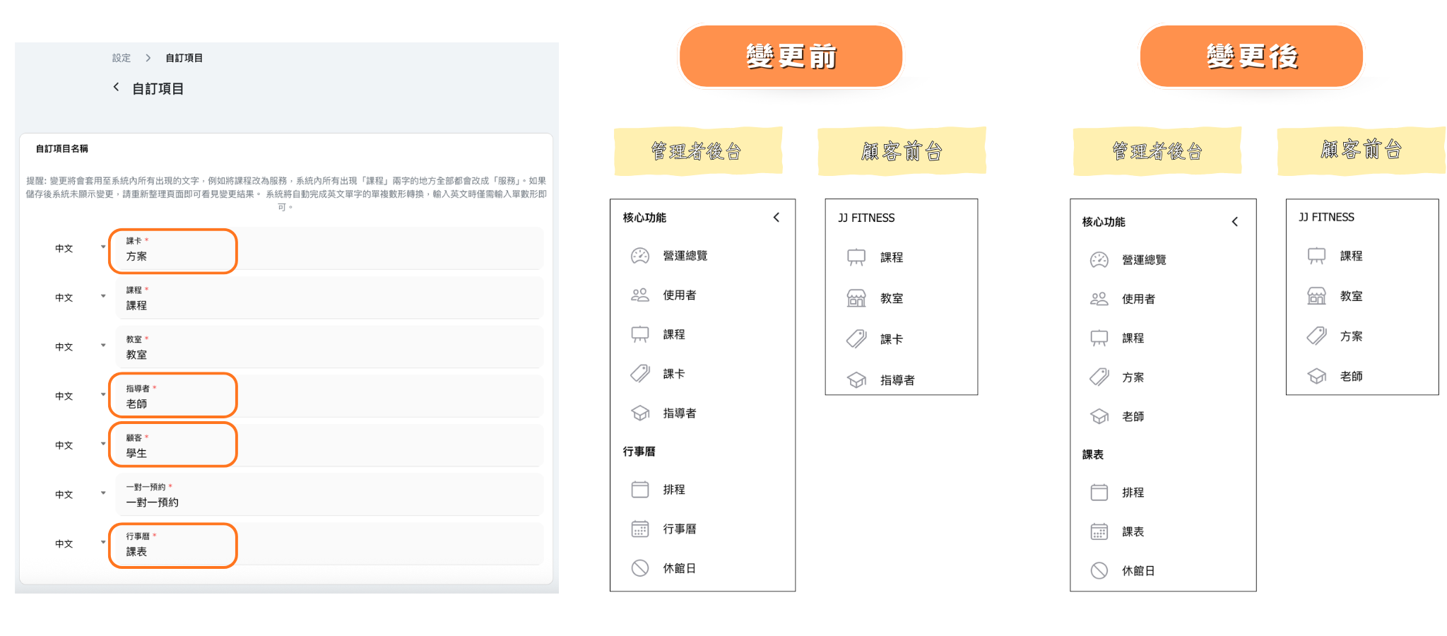 將課卡改為方案,系統內所有出現「課卡」兩字的地方全部都會改成「方案」。例如:「課卡規定」會變成「方案規定」、「購買課卡」會變成「購買方案」。