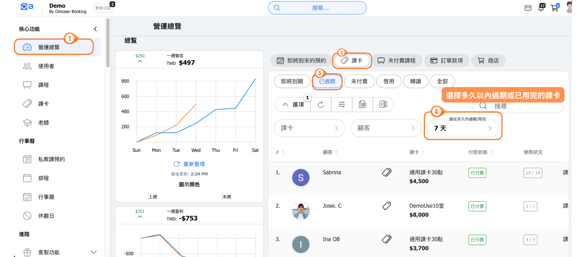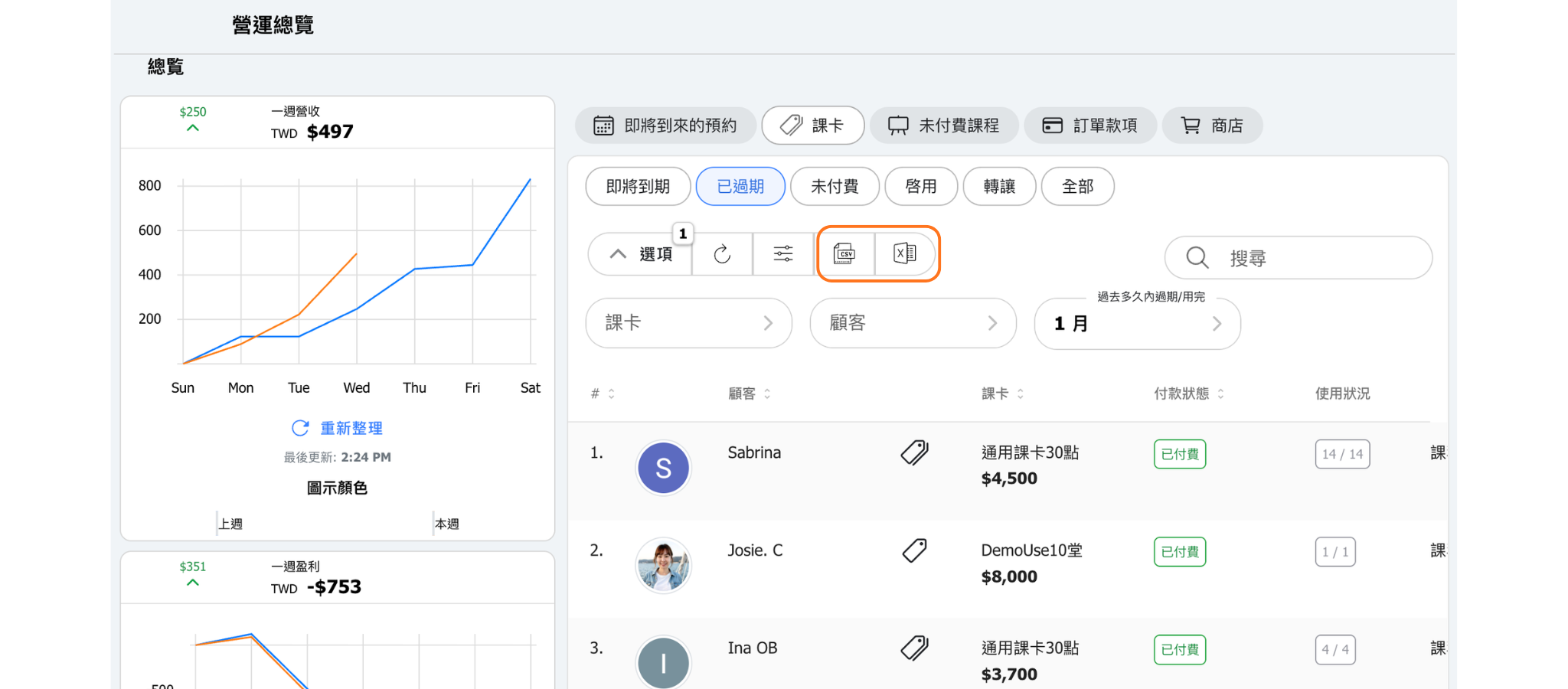 將用完的課卡與過期課卡分開追蹤,可提供寶貴的業務洞察: