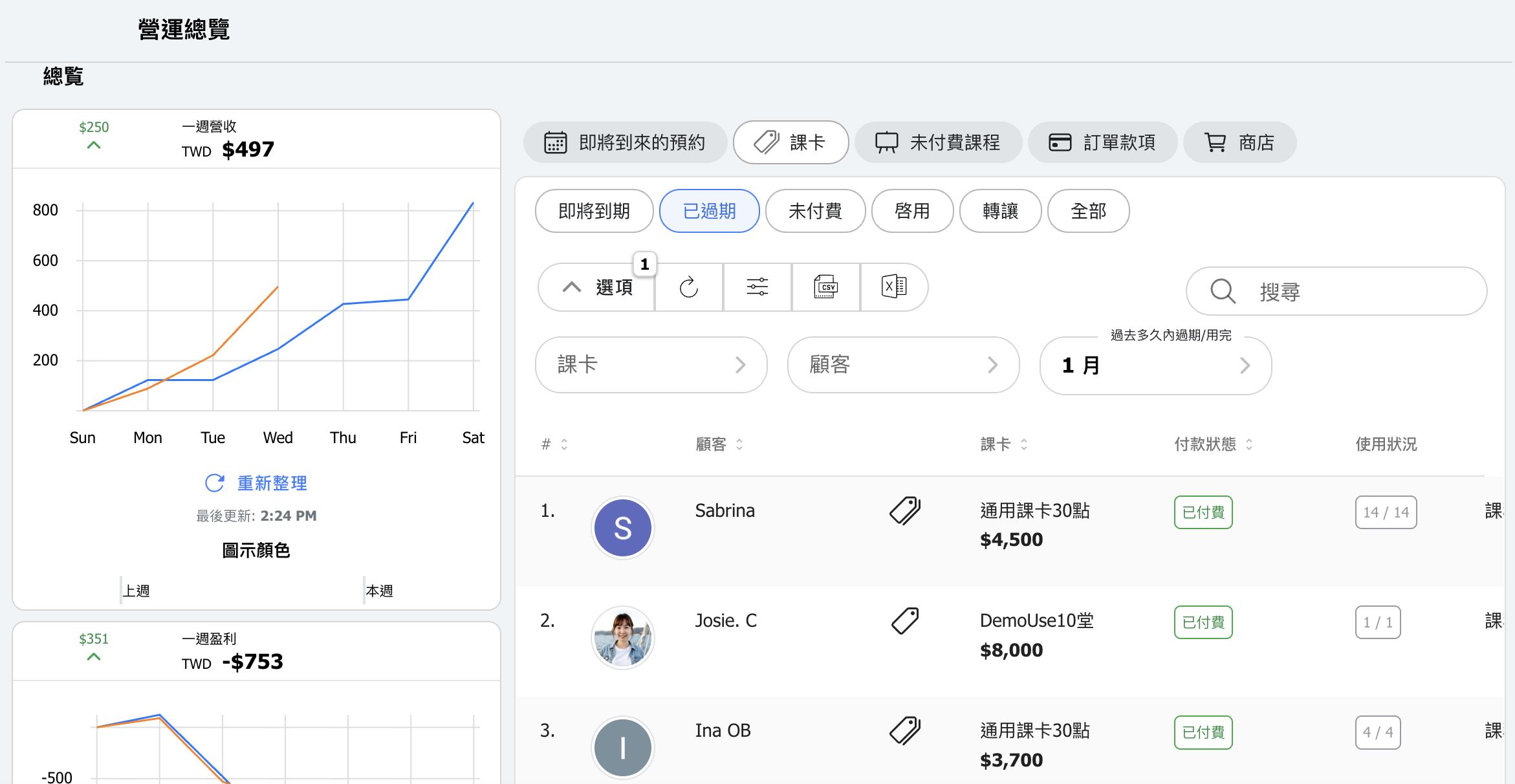 - 過去 1個月 內到期日的所有課卡(「已過期」狀態)