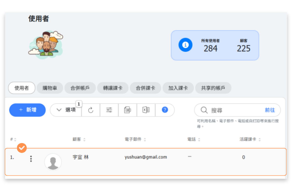 用戶頁面提供所有帳號的綜合視圖。您可以搜尋、篩選和查看用戶詳細資料。
