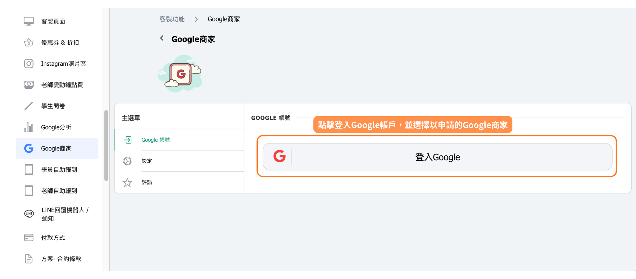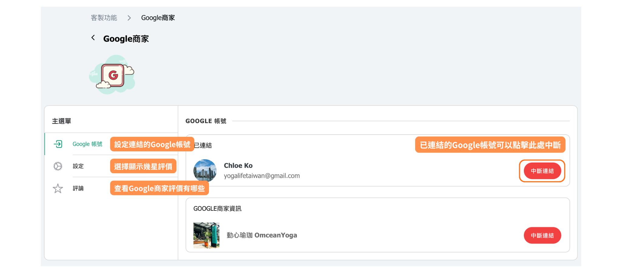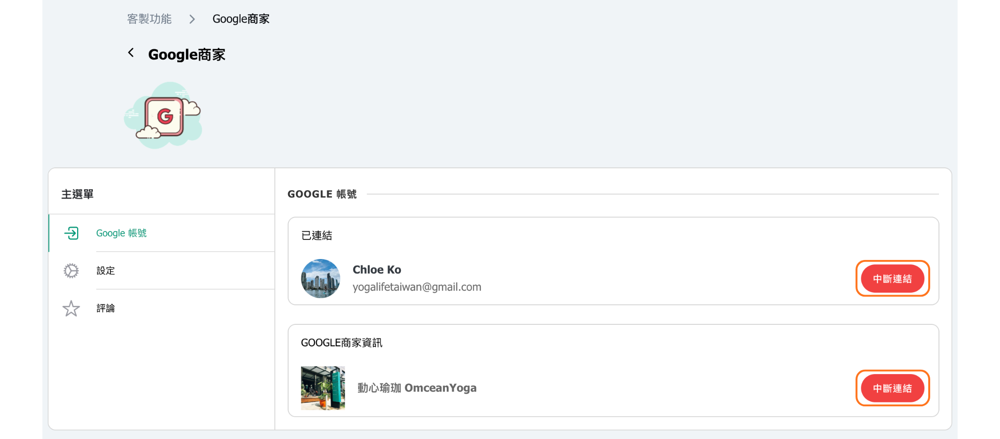 如需斷開Google商家帳戶連接,請前往客製功能中的Google商家,點擊斷開連接按鈕。