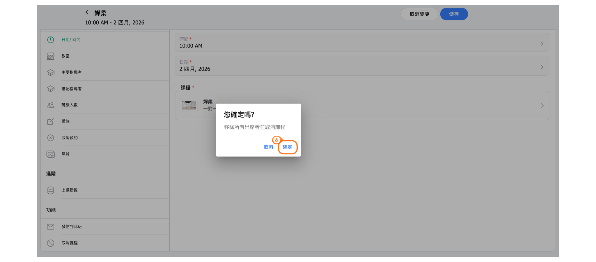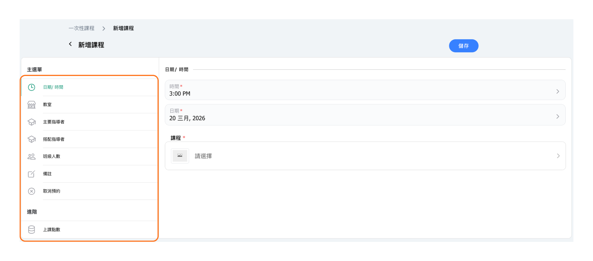 建立一次性課程時,您可以設定以下選項:日期/時間、教室、主要指導者、額外指導者、班級人數、備註、取消預約規則、課程點數。