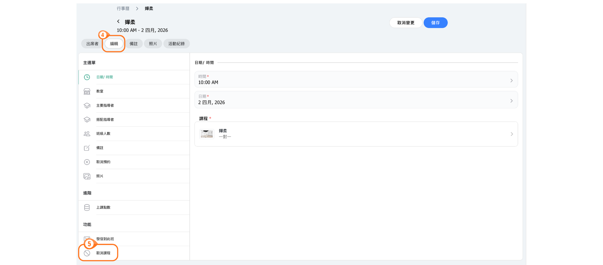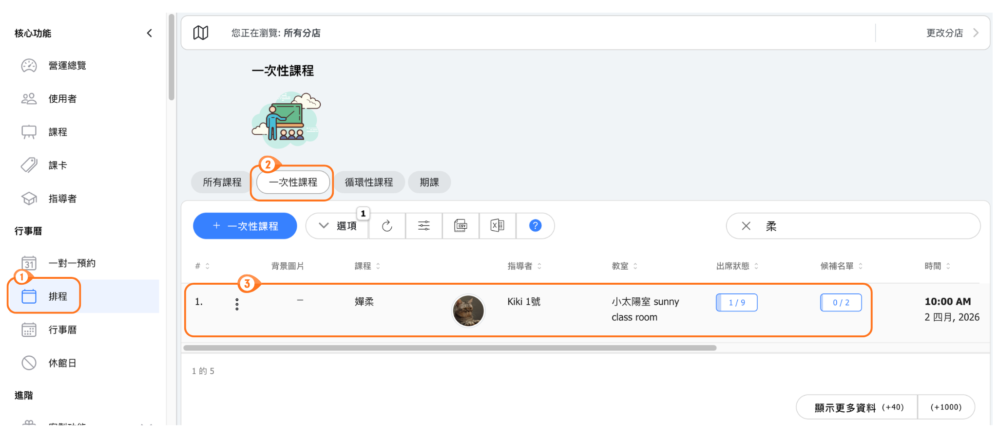 前往排程中的一次性課程標籤,找到課程後點擊進行編輯或刪除。注意:如果已有顧客預約,刪除課程會取消他們的預約。