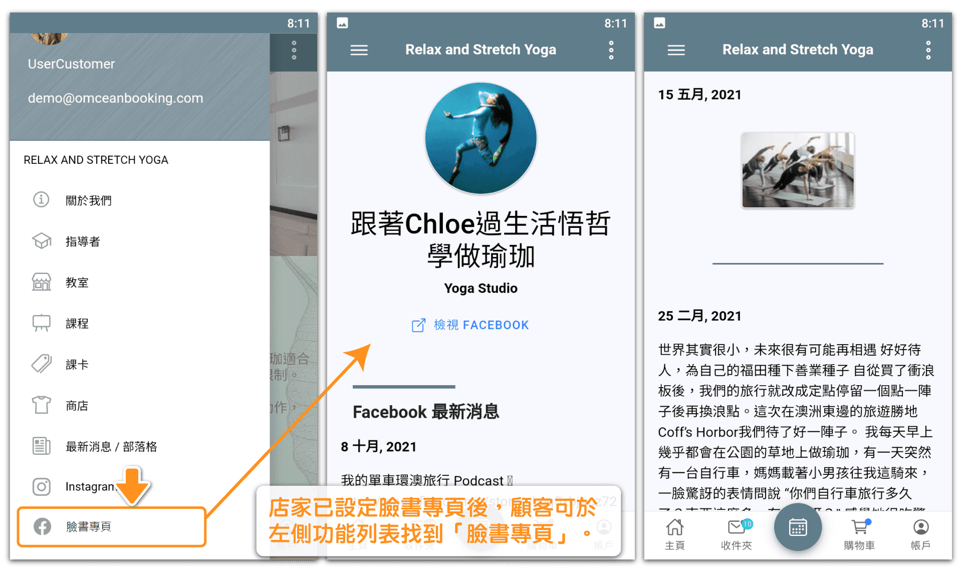 顧客可以從預約系統的側邊選單中選擇臉書專頁來瀏覽您的貼文和評價。
