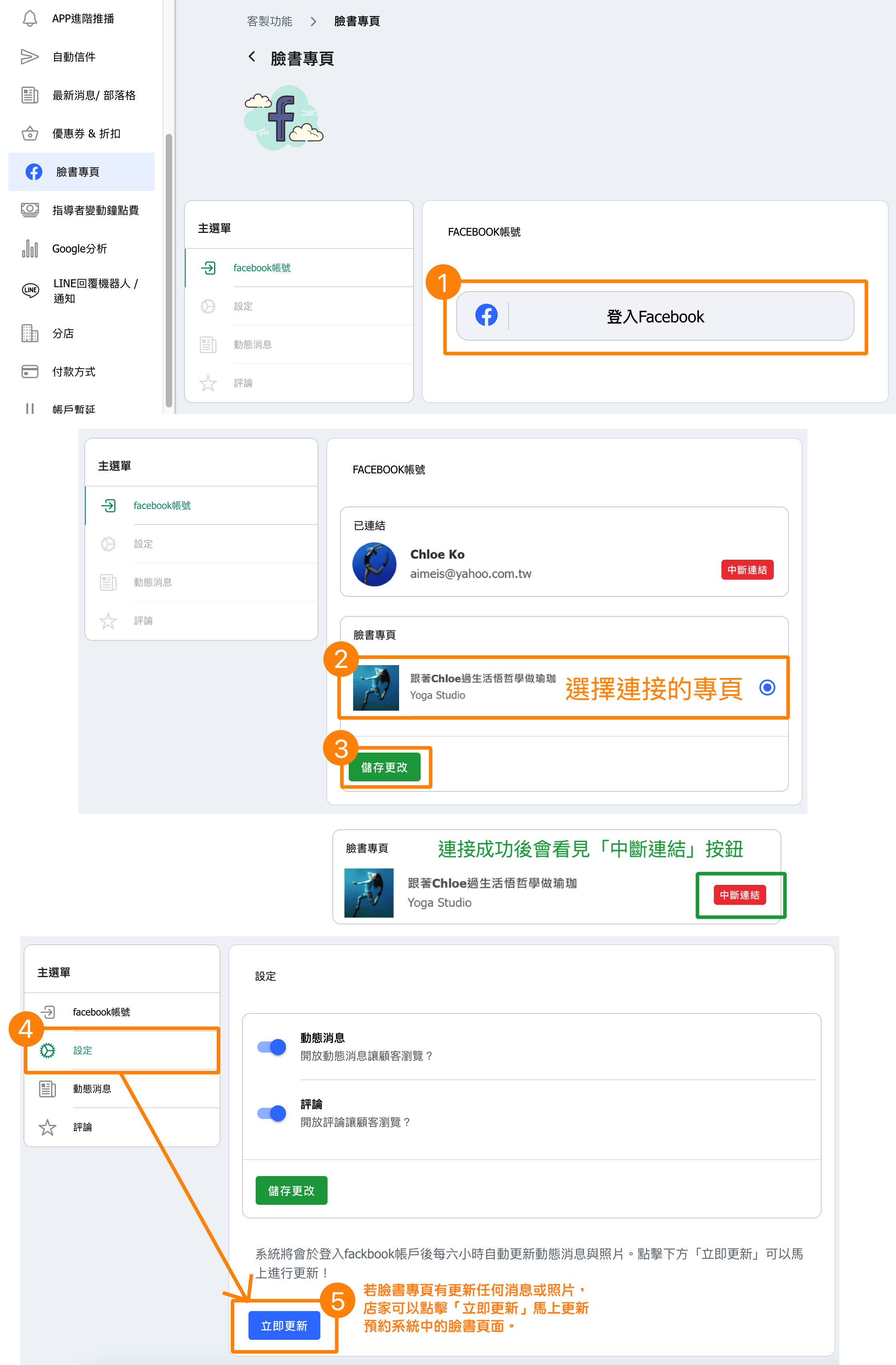 要斷開臉書專頁連接,請前往客製功能中的臉書專頁,點擊斷開連接按鈕。斷開後,顧客將不再看到您的Facebook內容。