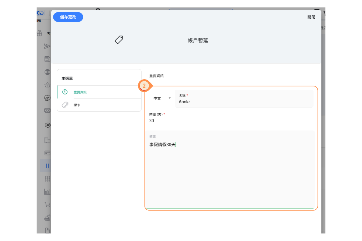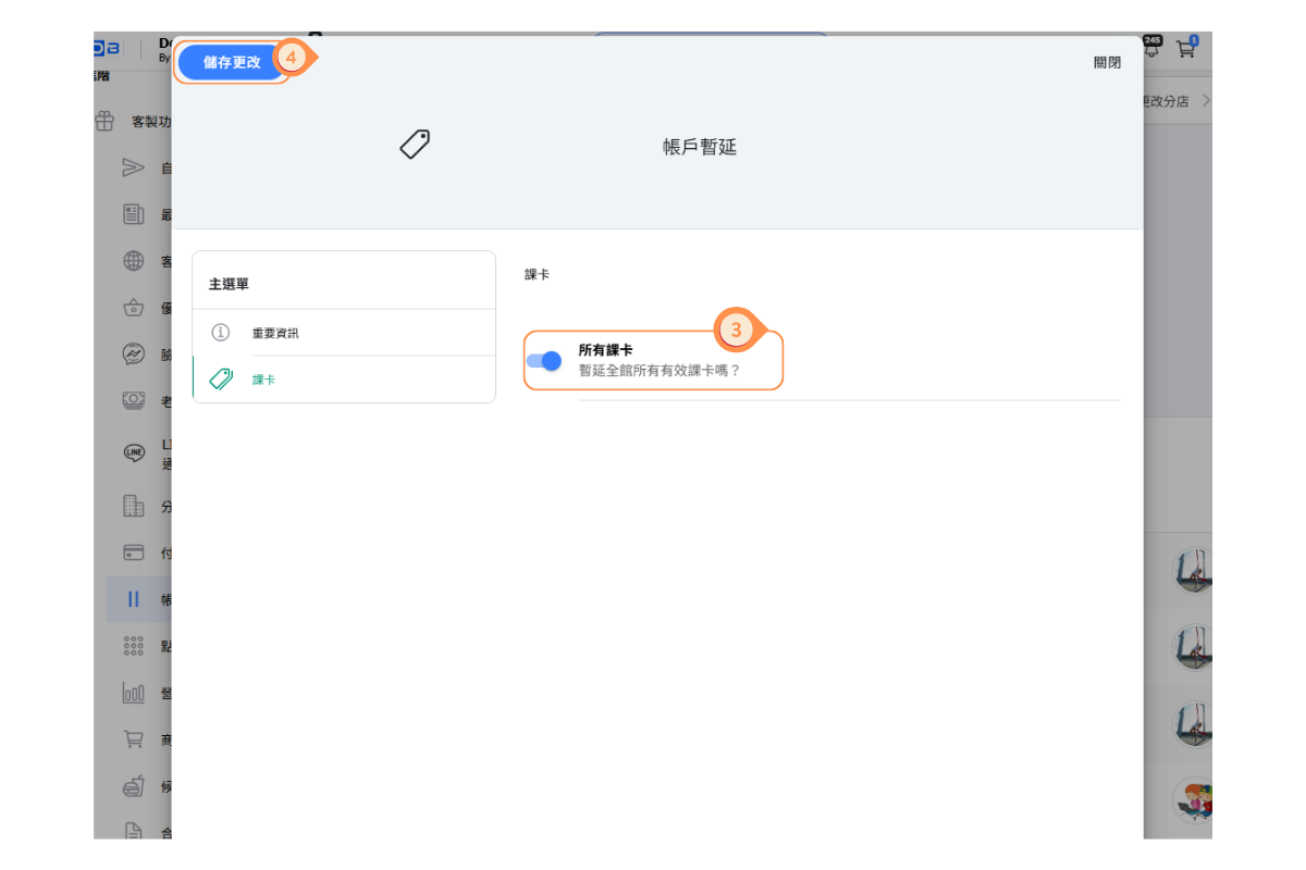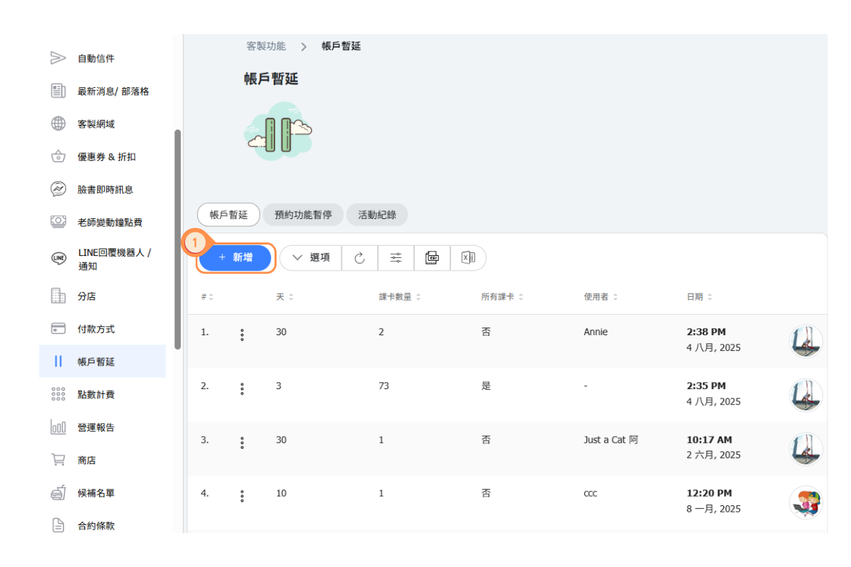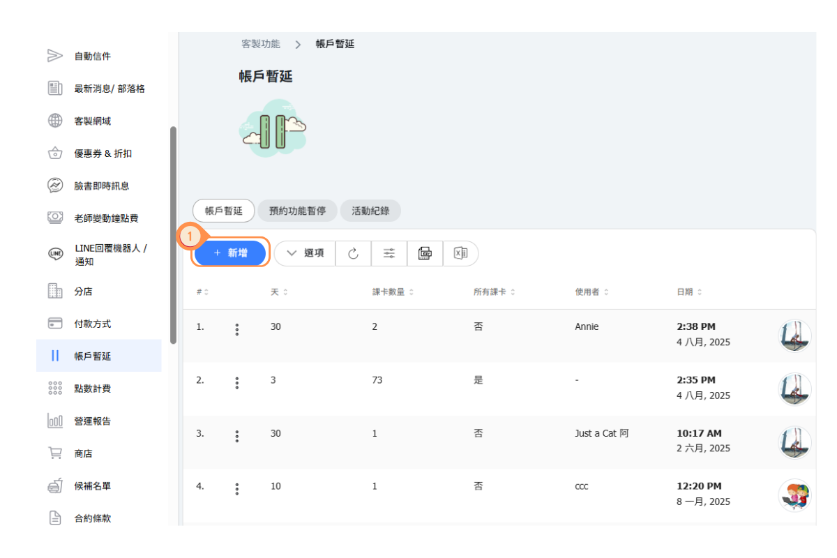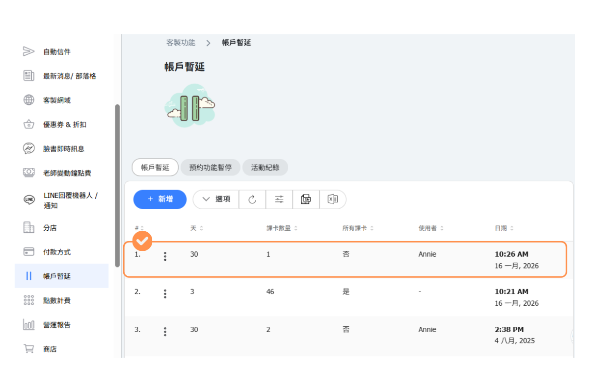 3. 儲存後可在「帳戶暫延」頁面與該顧客課卡的「活動紀錄」中查看紀錄。