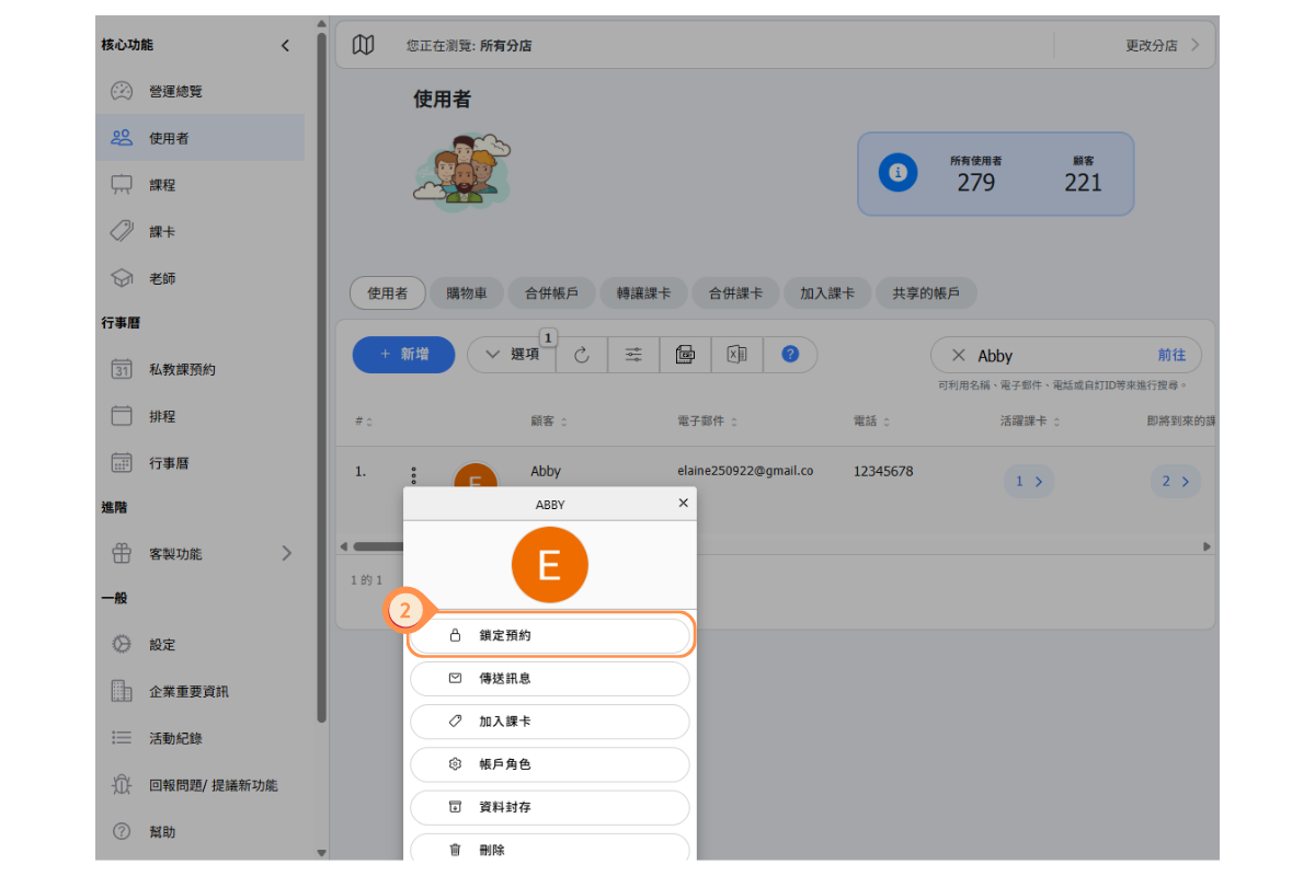 路徑:使用者 → 選擇學生 → 點擊頭像左邊三點 → 鎖定預約