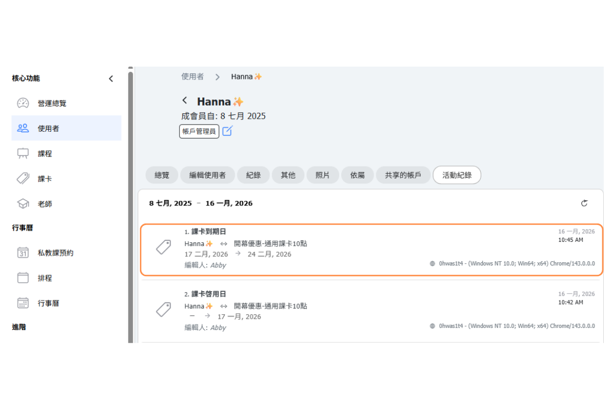 4. 顧客的課卡「活動紀錄」中,也會同步顯示延期紀錄。