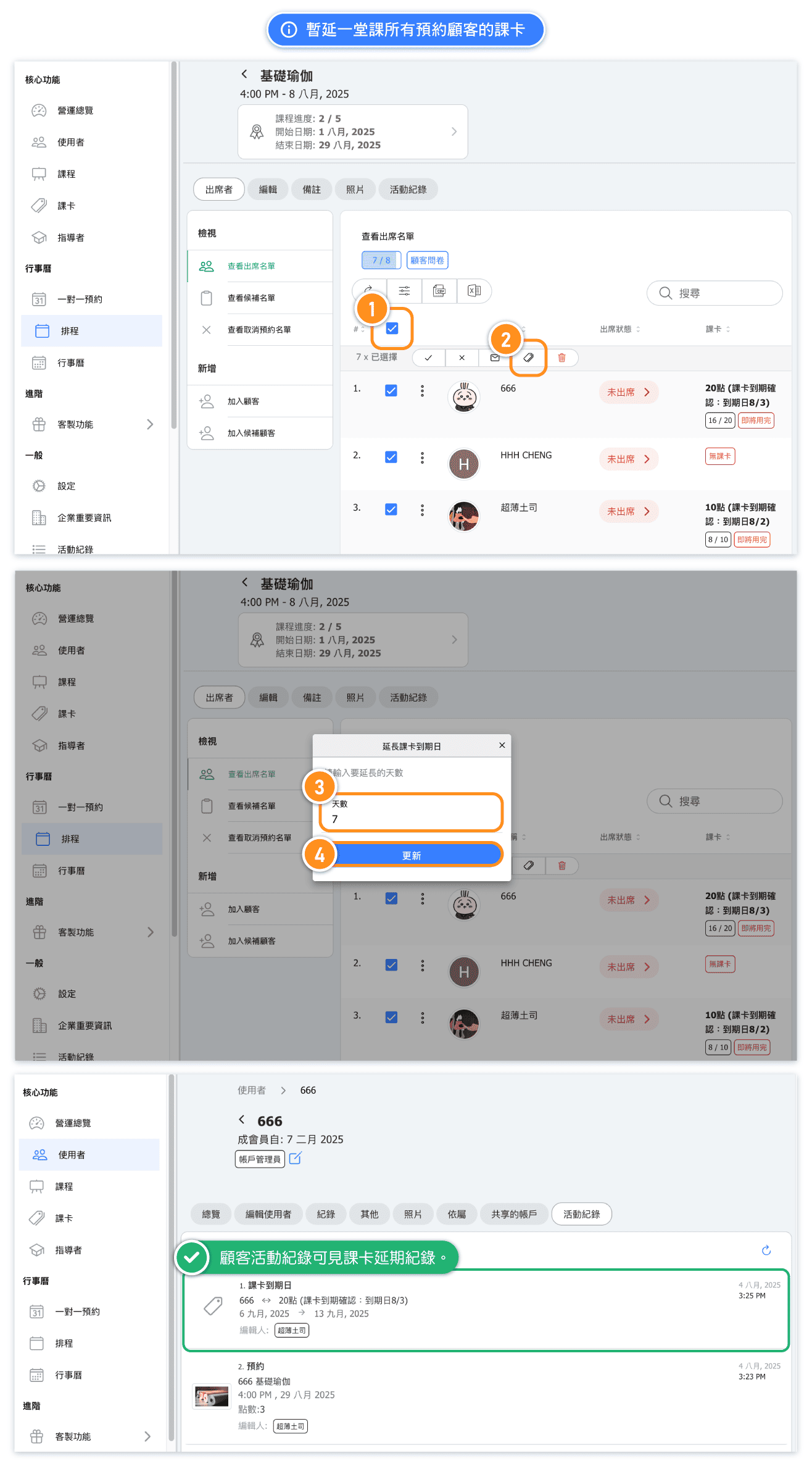 批量延長時,系統會將延長應用到每位學生用於預約該課程的課卡。即使學生有不同的課卡類型,也能正常運作。