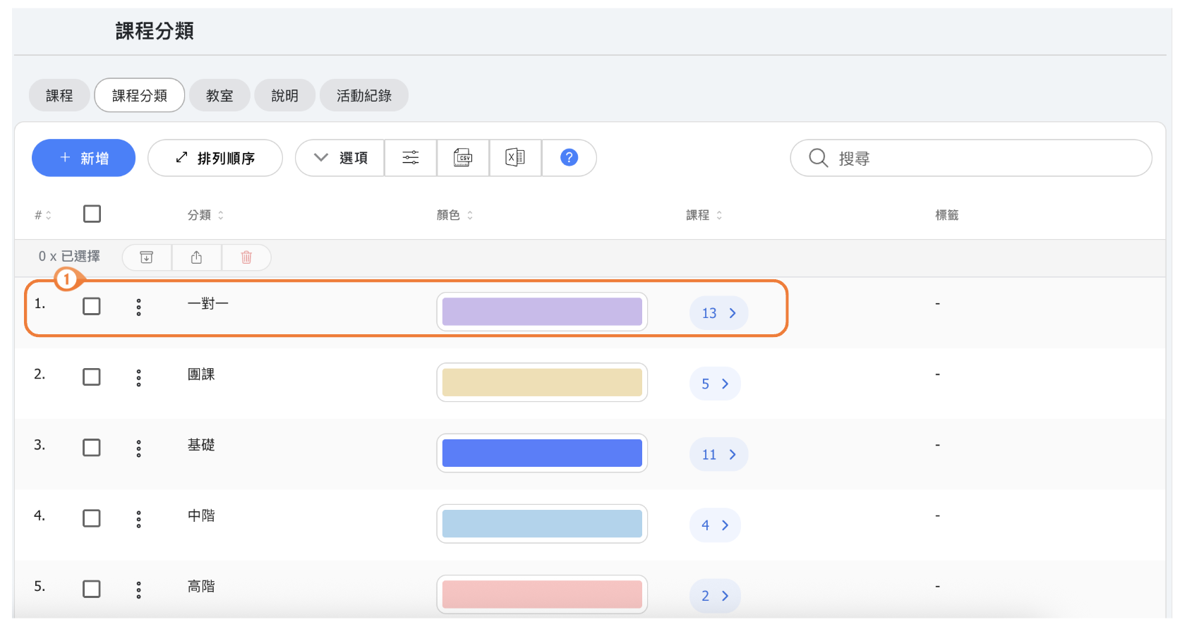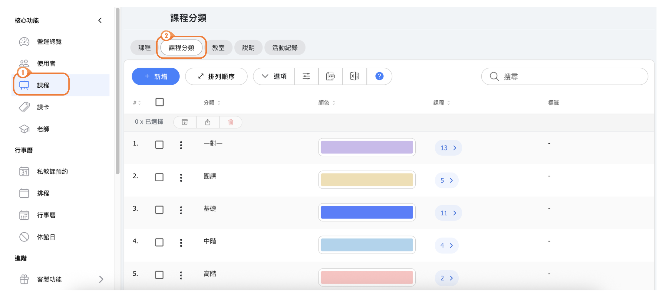 🔹 顏色 - 為分類選擇顏色。此顏色會作為標籤顯示在該分類的課程旁邊,在日曆和課程列表中提供快速視覺識別。