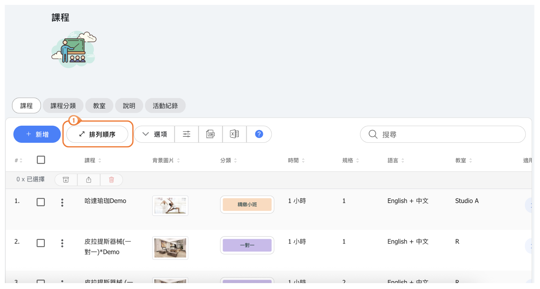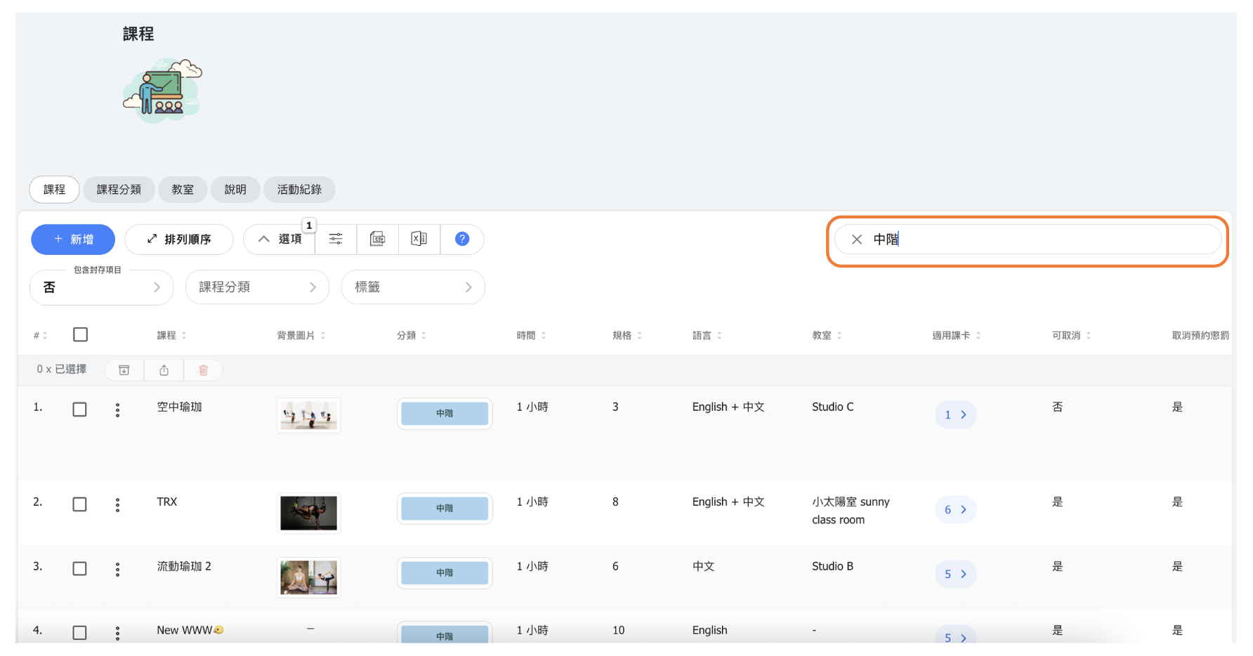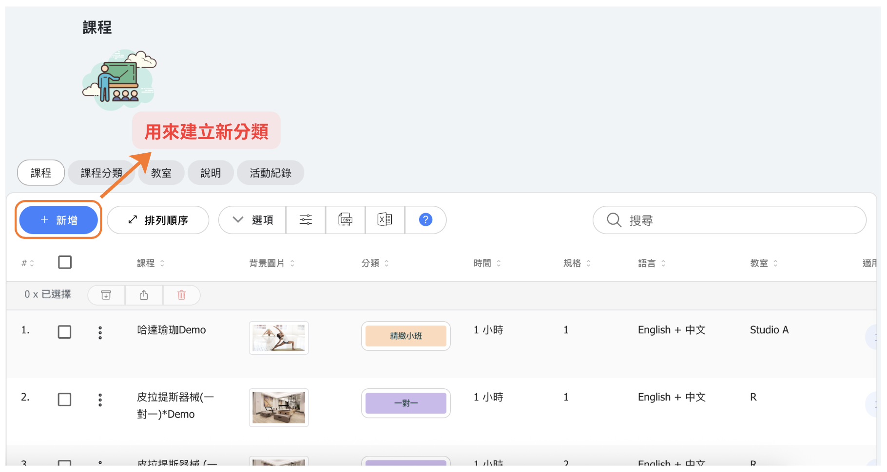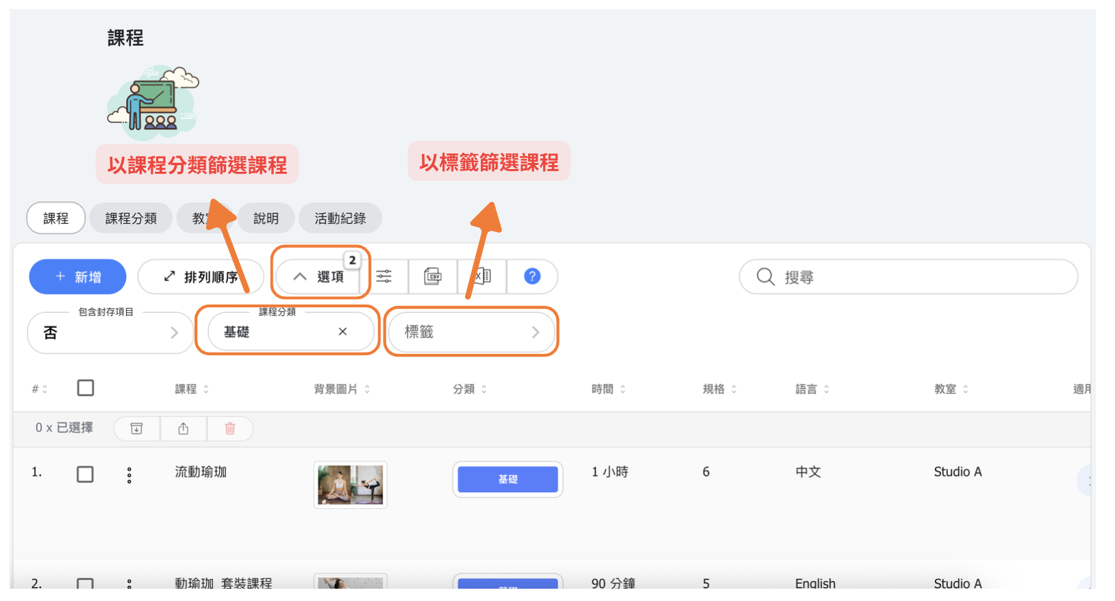 - 考慮使用技能等級分類(初學者、中級、進階)或課程類型分類(瑜伽、皮拉提斯、HIIT)