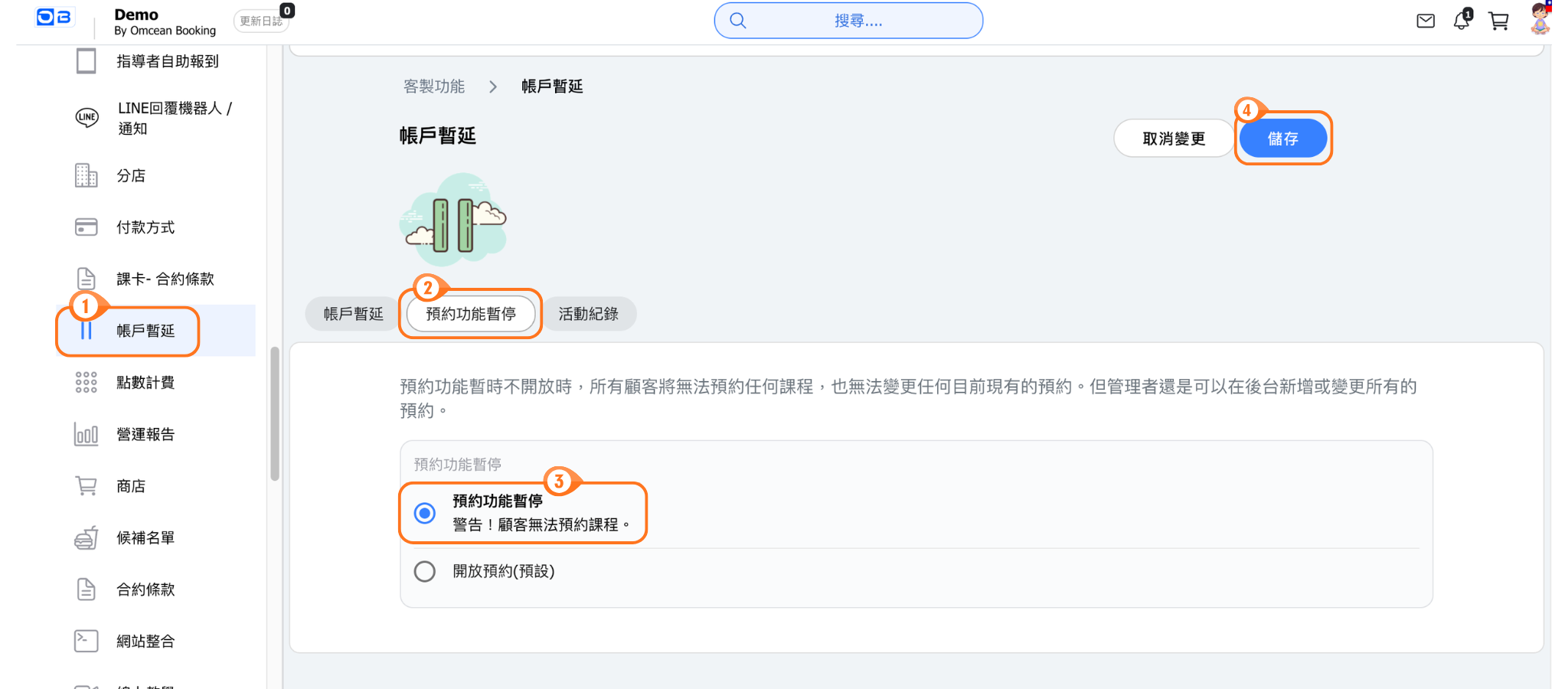 👉🏻 利用客製功能「帳戶暫延」→「預約功能暫停」可暫停顧客的預約功能。