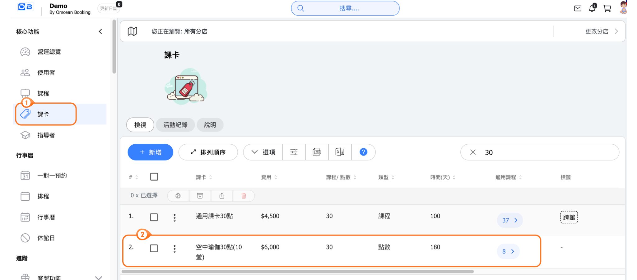 - 調整課卡頁面的課卡項目「點數」與「金額」並不影響顧客已持有的課卡。
