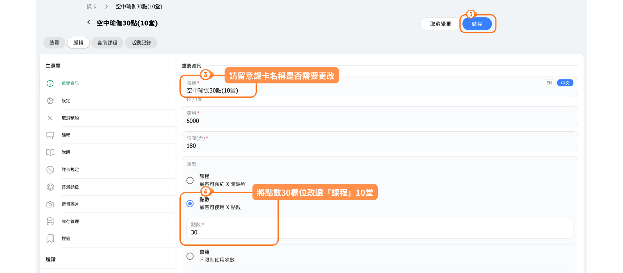 將原有課卡販售點數依照步驟一計算的比例更改為堂數。例如,將「空中瑜珈30點」更改為可預約 10 堂空中瑜珈,將點數位置的數值從 30 變更為 10。
