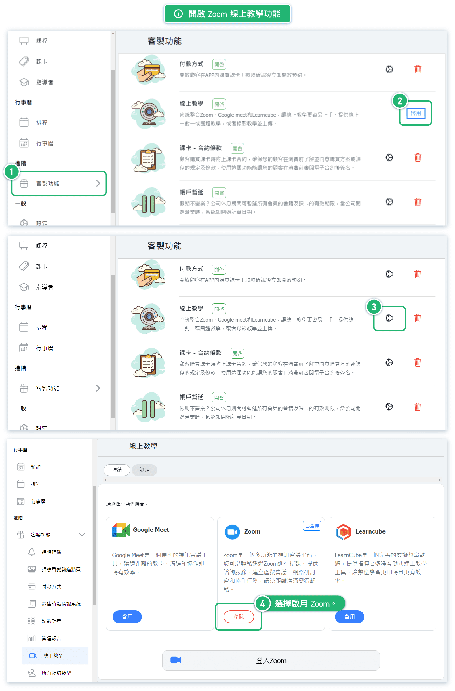 在連接 Zoom 帳號之前,您需要在系統中啟用線上教學功能: