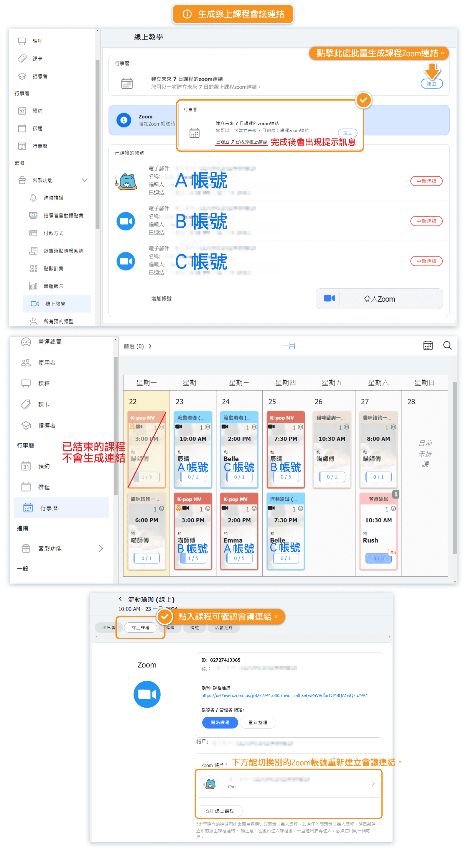 系統允許您一鍵為未來 7 天內所有已排定的課程生成 Zoom 會議連結。