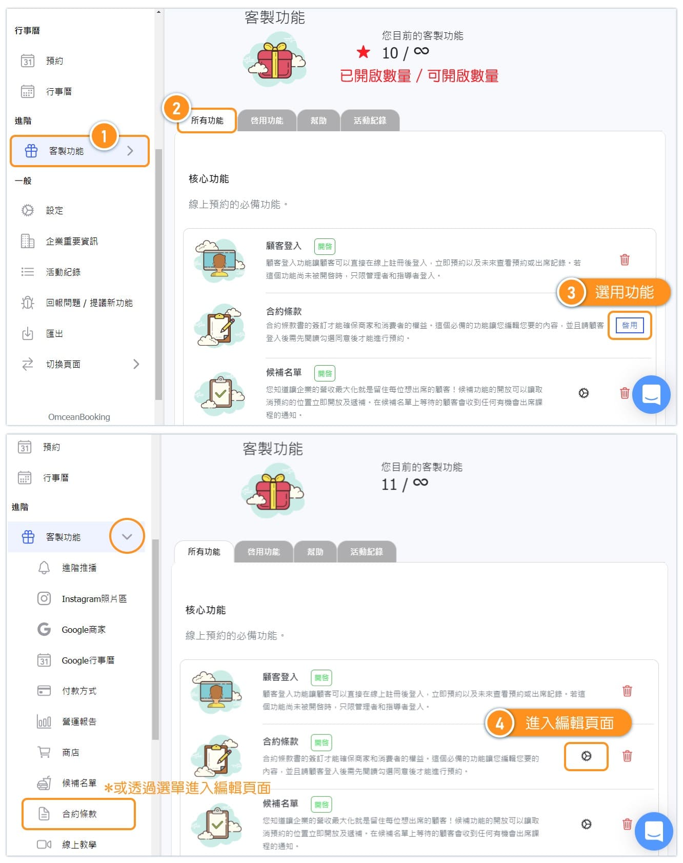 重要提示:啟用前請確保您的方案還有可用的客製功能名額。如果已達上限,您需要停用其他功能或升級方案。