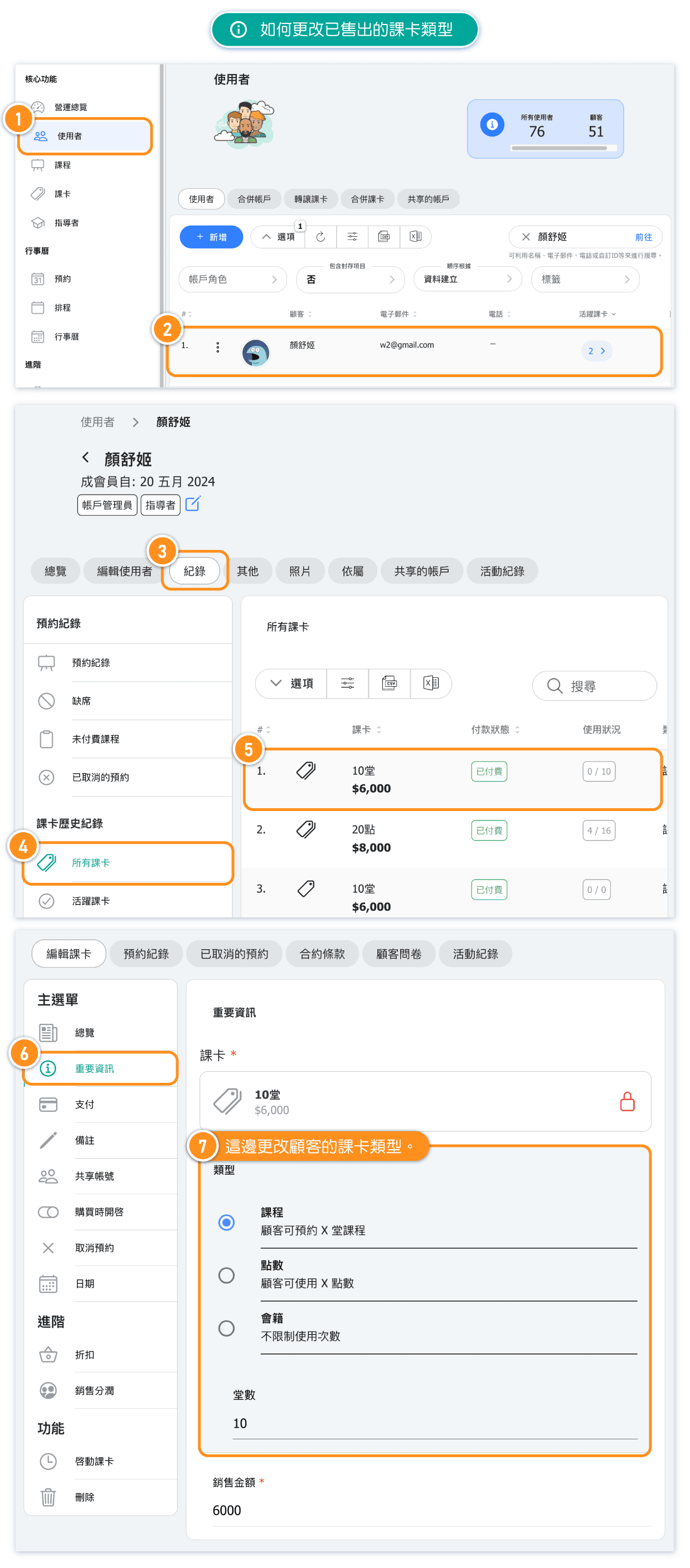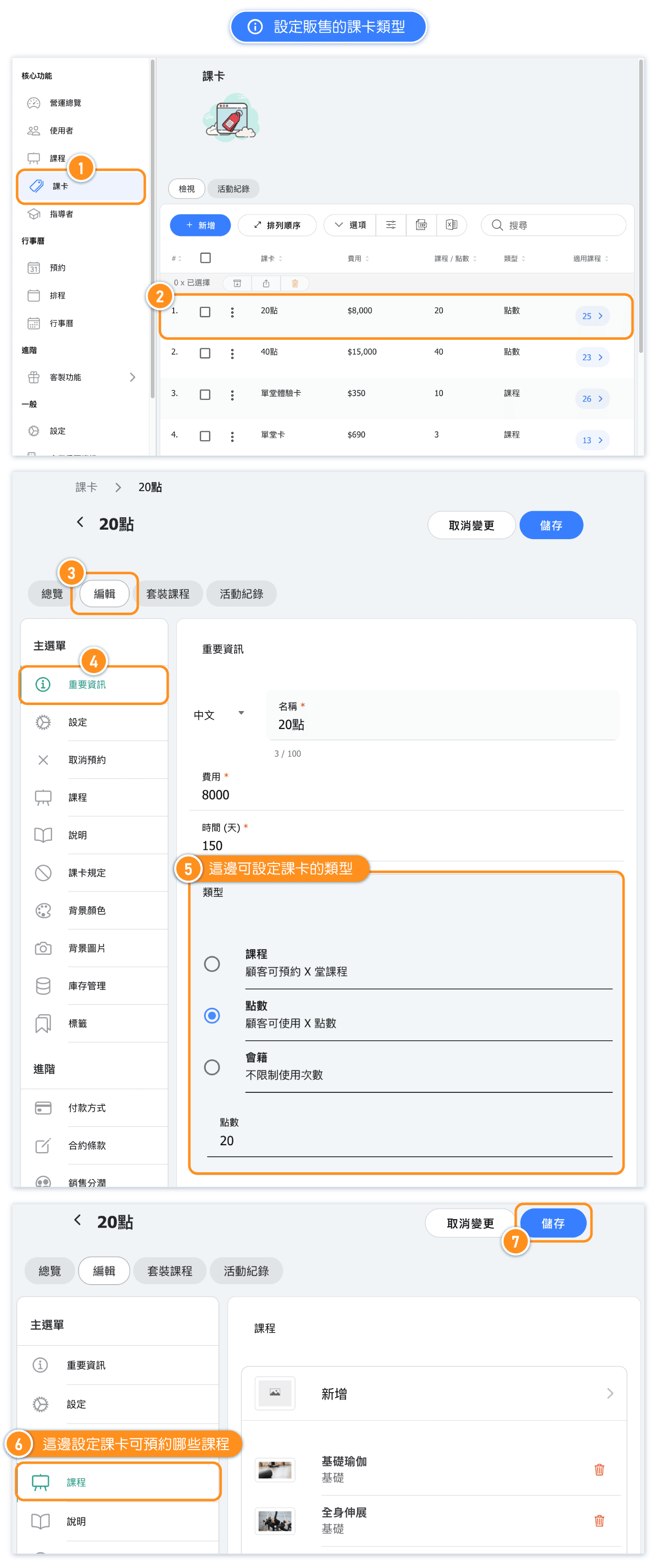 提示:如果已經販售的課卡需要變更,請到使用者頁面,找到顧客的課卡設定進行修改。