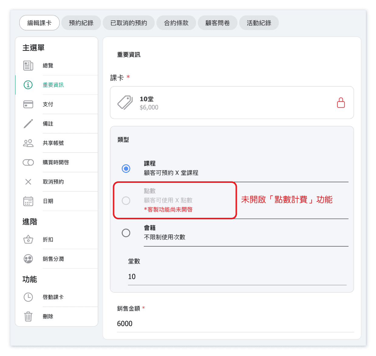 無法。您需要啟用「點數計費」功能才能設定課卡作為點數販售。常見問答:為什麼我沒有辦法設定課卡以點數方式販售?