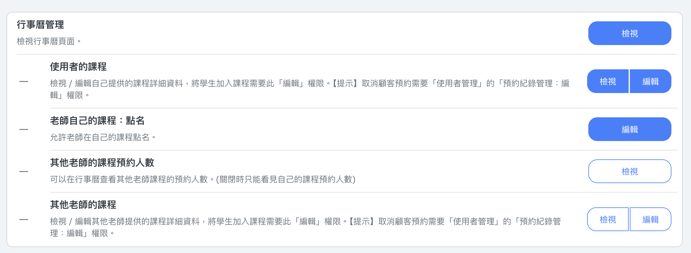 | 行事曆管理:查看 | 允許使用者查看行事曆頁面。這是存取行事曆所需的基本權限。 |